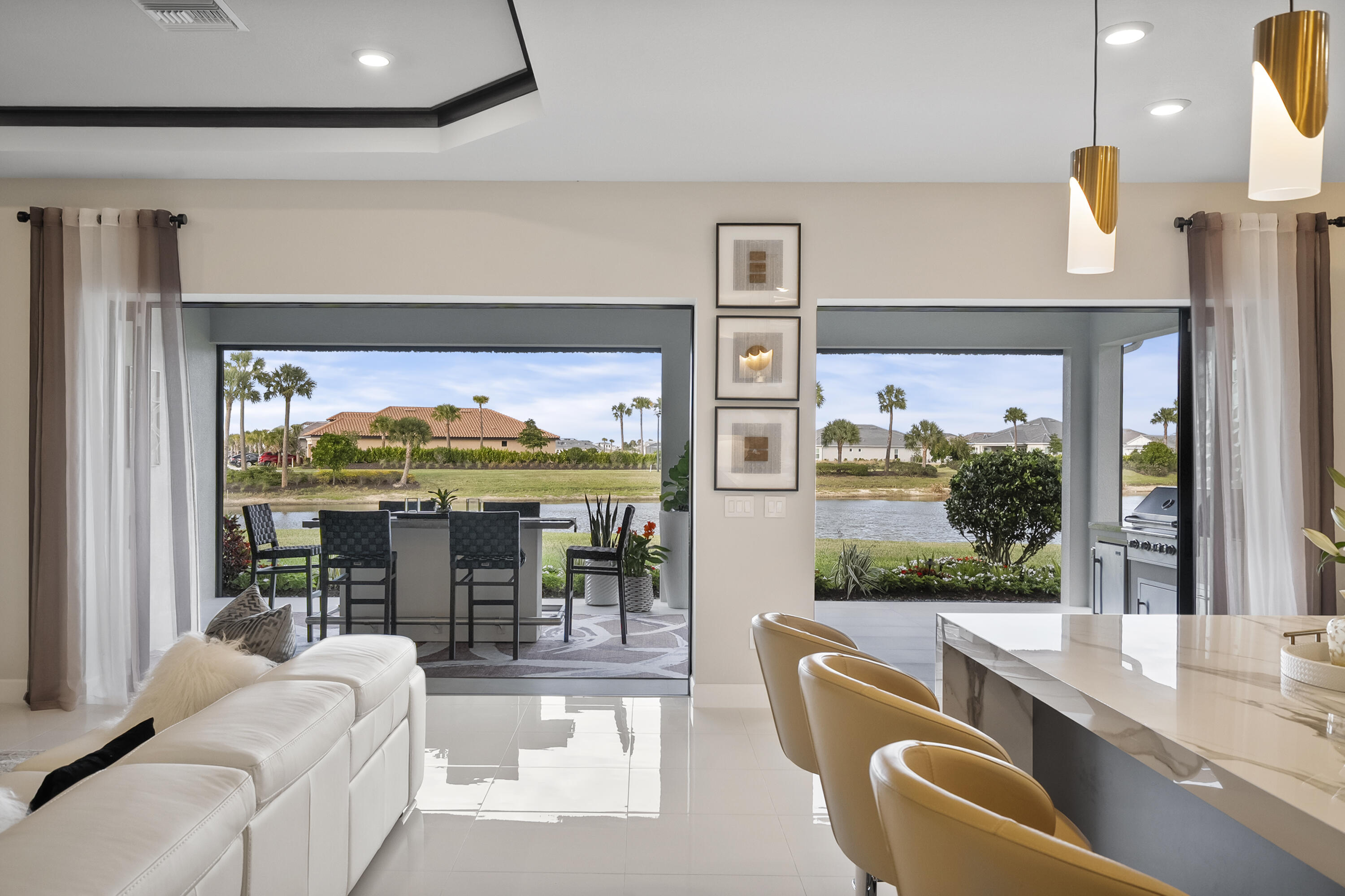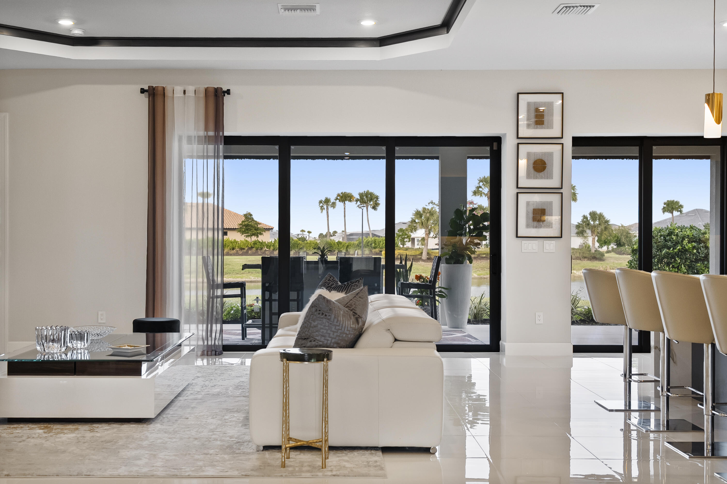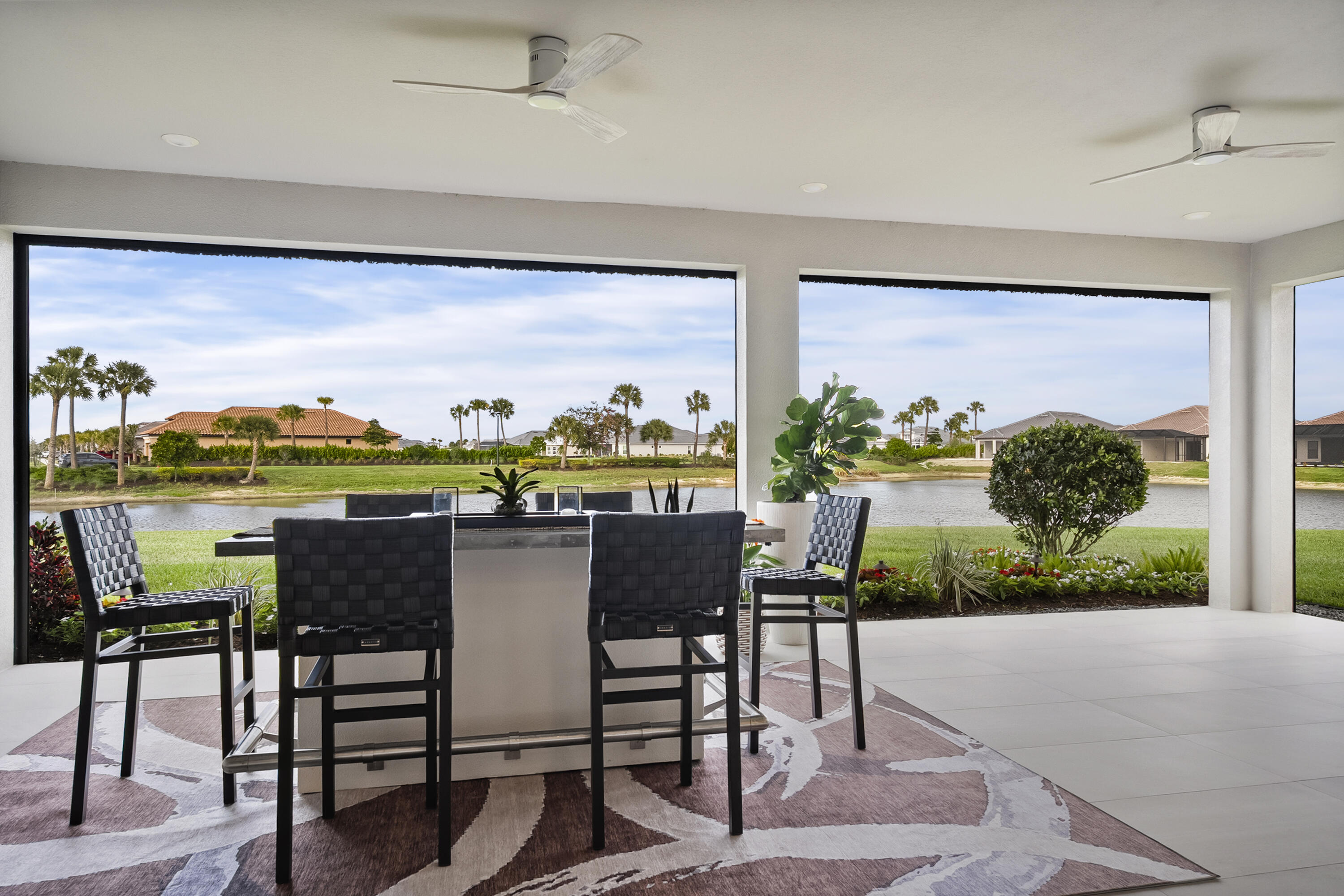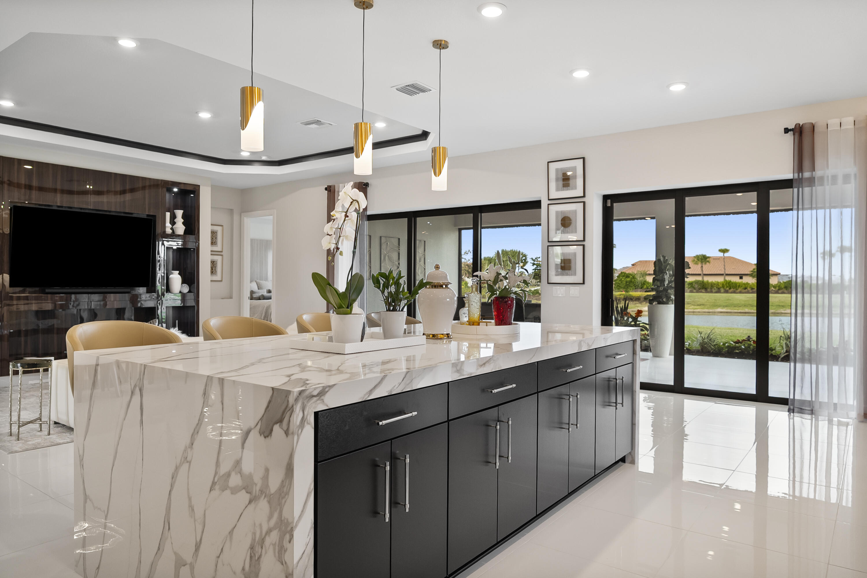 This Pallazio floor plan features extensive post-construction upgrades that go far beyond builder offerings. Offering 3 bedrooms, 3 bathrooms, plus a study/flex space, this exceptional home is situated on a quiet cul-de-sac on an oversized .36-acre pie-shaped lot that widens at the rear and overlooks a serene lake. Structural enhancements include an extended covered lanai, extended gourmet kitchen, outdoor kitchen gas and plumbing rough-ins, and extended bay windows in the primary suite. All impact windows and doors, paired with a brand-new barrel tile roof (2023), provide peace of mind and contribute to lower homeowners insurance rates. Inside, oversized porcelain tile flooring throughout (no carpet) creates a light, airy, and cohesive aesthetic. Professionally designed interiors take take this home to the next level with elevated finishes and thoughtful details throughout. The upgraded extended gourmet kitchen is an entertainer's dream, featuring all Thermador appliances, including a built-in refrigerator and wine fridge. A Thermador gas cooktop with griddle, paired with a custom range hood and built-in wall ovens, adds both function and style. The true showstopper is the 3-inch mitered porcelain countertops, a premium feature not offered by the builder, anchored by a striking waterfall island. The living room showcases a custom acrylic wood-finish built-in with integrated lighting. Pocket sliding glass doors seamlessly blend indoor and outdoor living, opening to lake views and an extended lanai equipped with motorized roll-down screens on all three openings, controlled at the touch of a button. The primary suite is nothing short of spectacular, enhanced by the bay window extension that floods the space with natural light and creates a private sitting area. The spa-like primary bath features dual shower heads, and the custom-designed walk-in closet is truly ready for your Chanel. This home offers a rare combination of design, upgrades, location, and lifestyle. A must-see for buyers seeking refined luxury and effortless indoor/outdoor living.