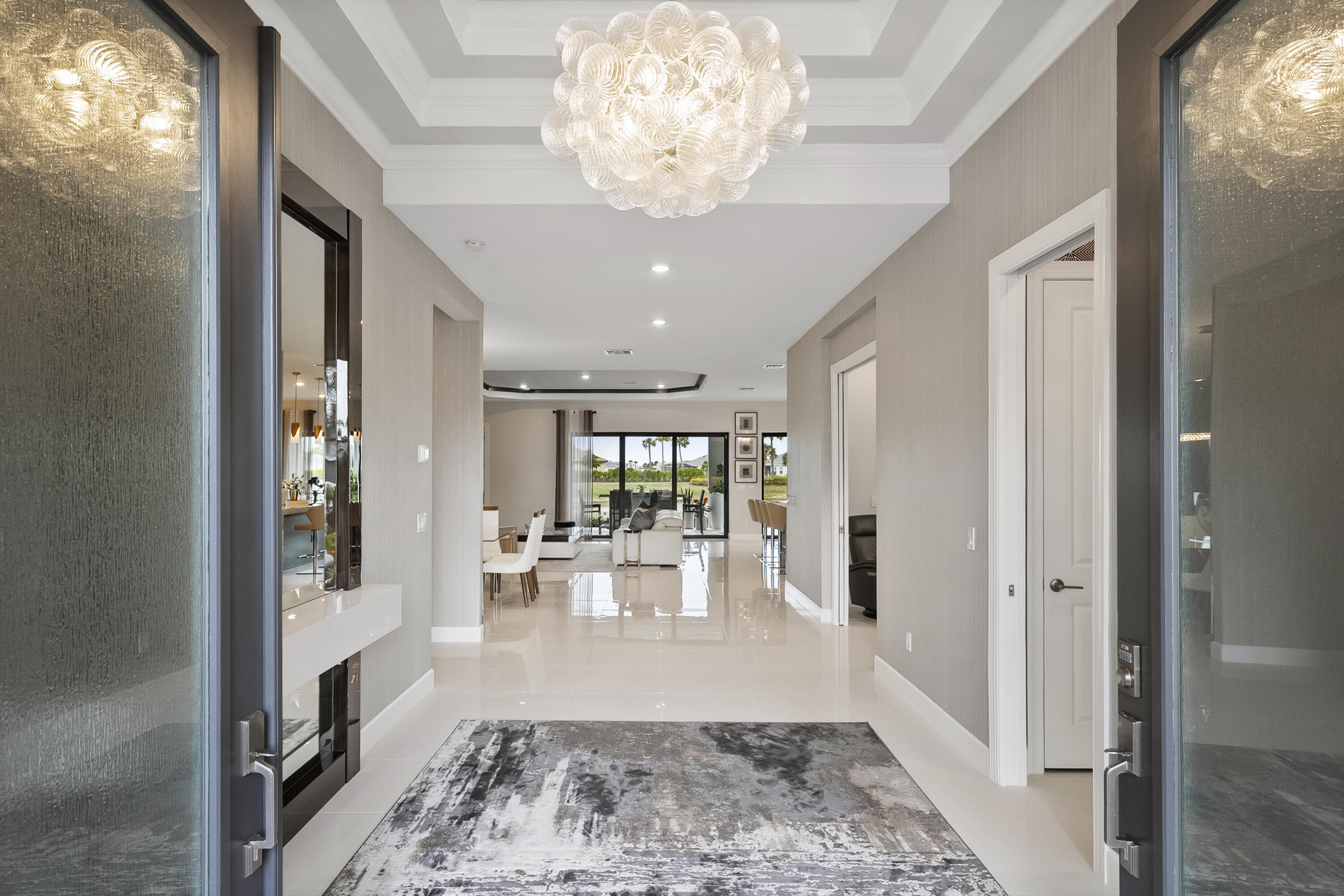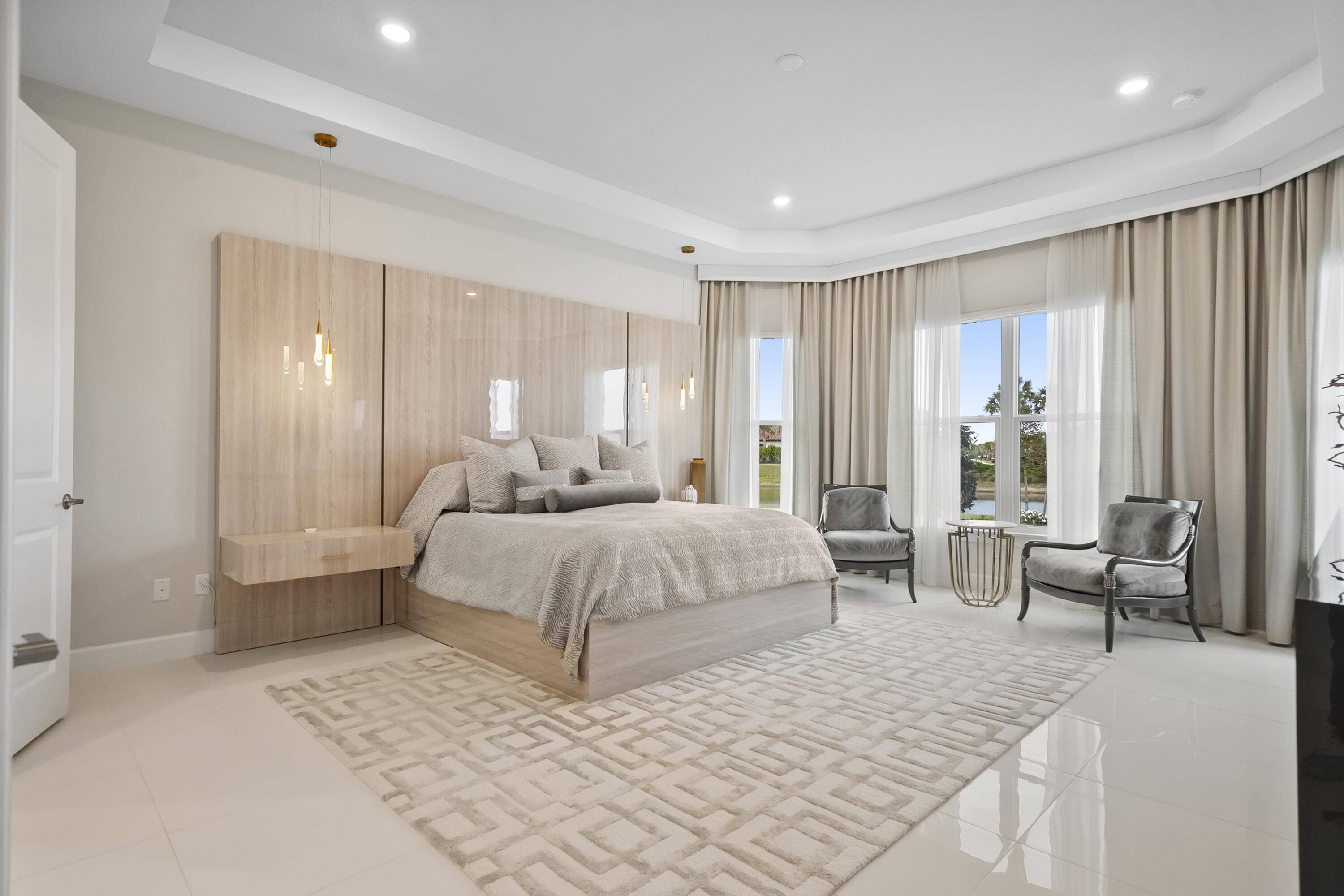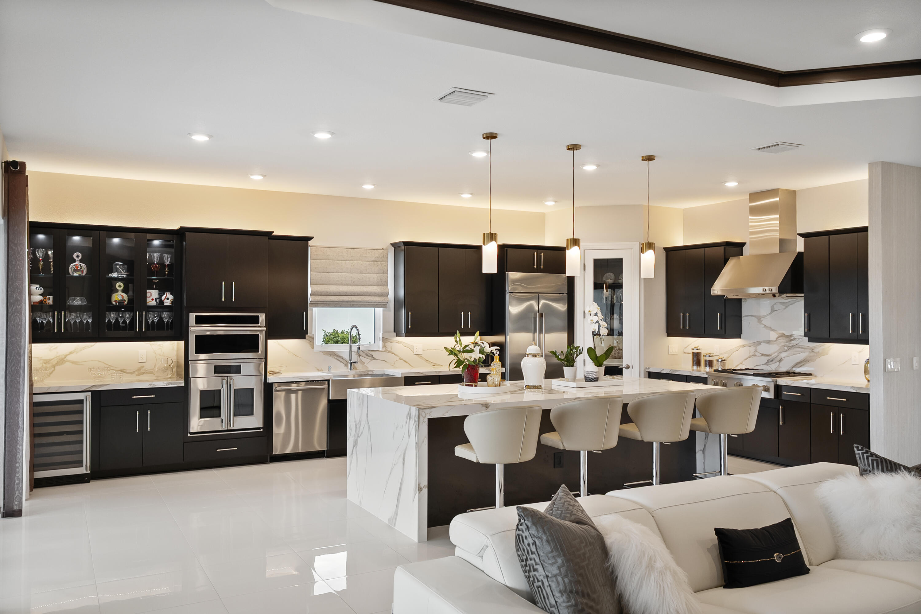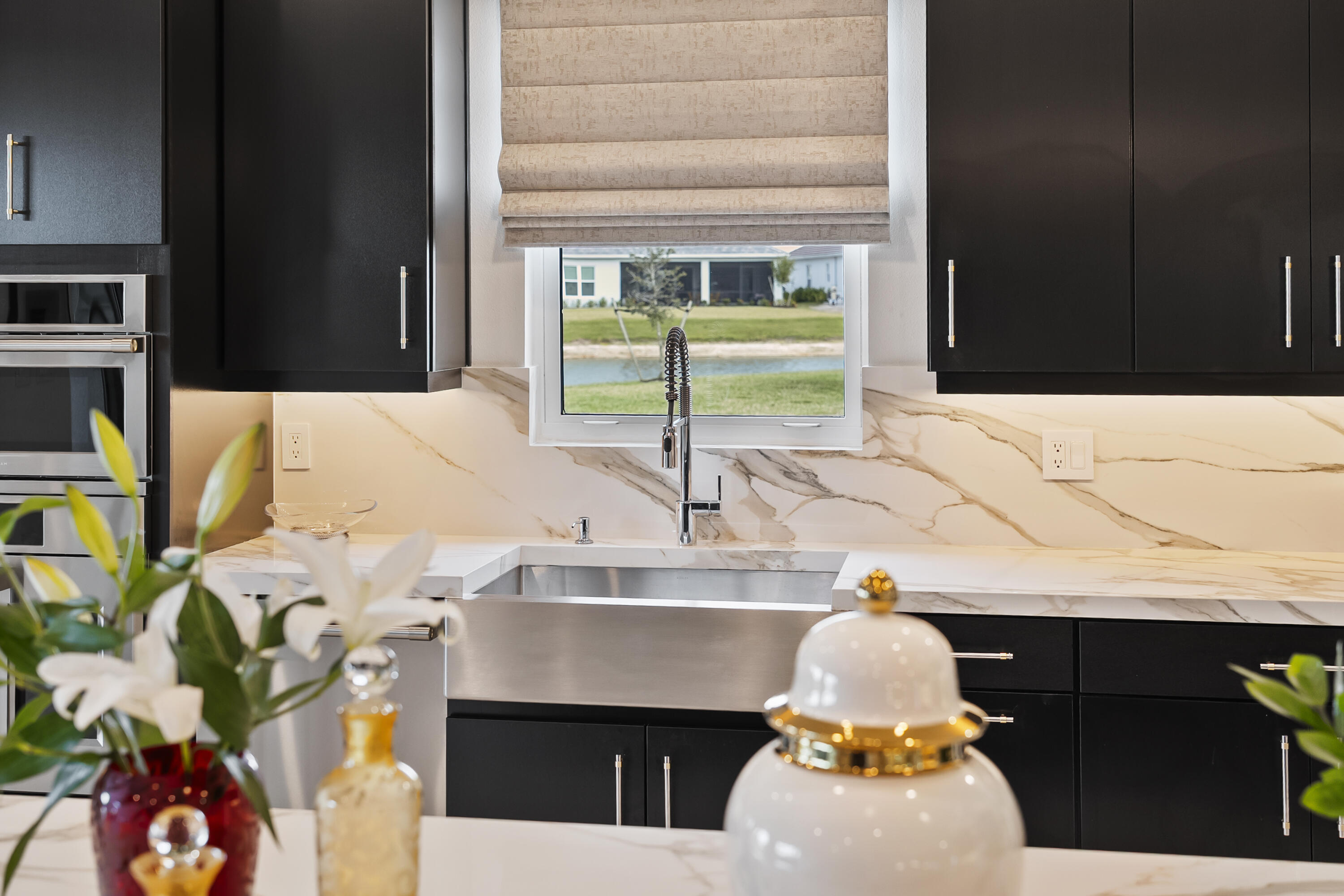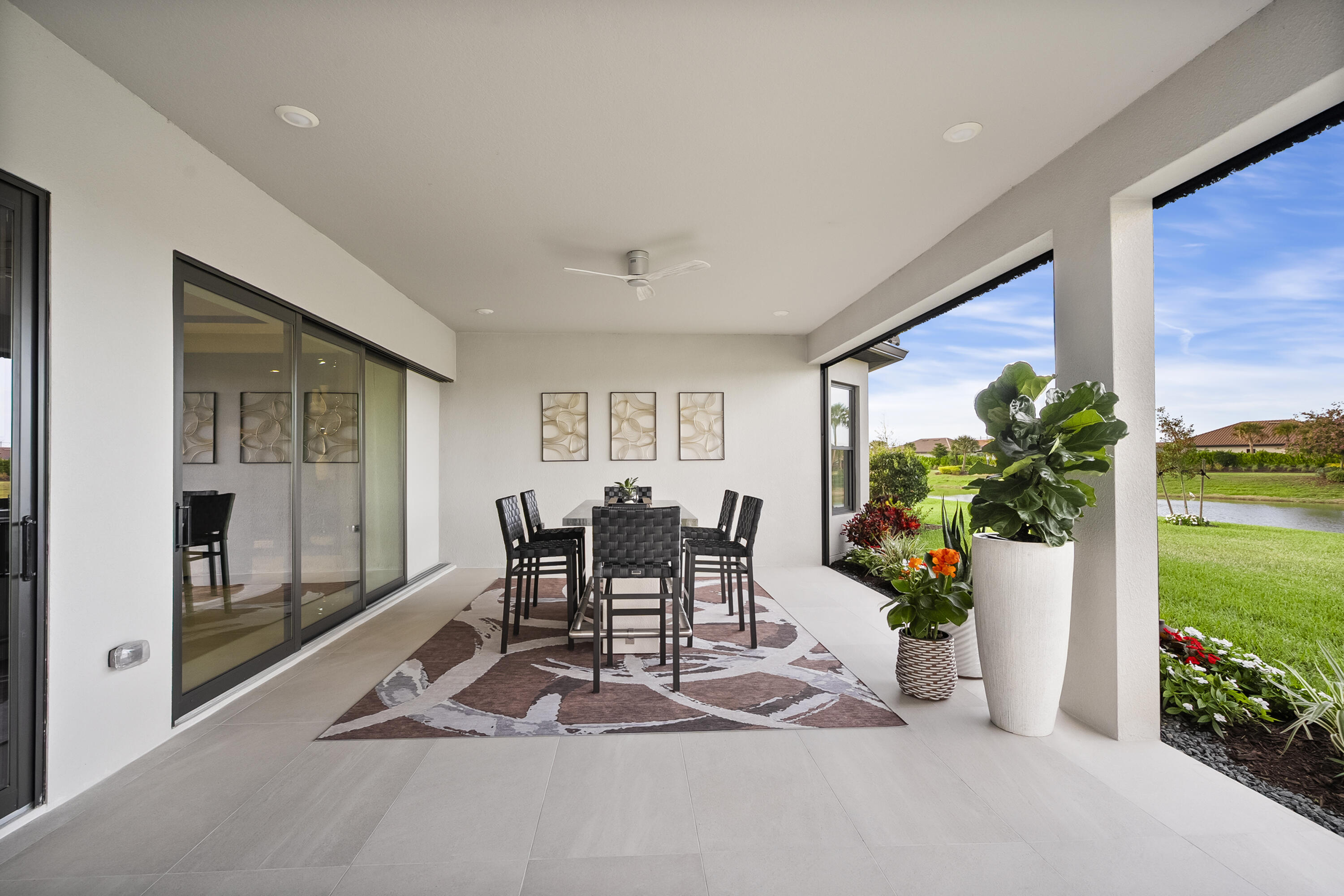 This Pallazio floor plan features extensive post-construction upgrades that go far beyond builder offerings. Offering 3 bedrooms, 3 bathrooms, plus a study/flex space, this exceptional home is situated on a quiet cul-de-sac on an oversized .36-acre pie-shaped lot that widens at the rear and overlooks a serene lake. Structural enhancements include an extended covered lanai, extended gourmet kitchen, outdoor kitchen gas and plumbing rough-ins, and extended bay windows in the primary suite. All impact windows and doors, paired with a brand-new barrel tile roof (2023), provide peace of mind and contribute to lower homeowners insurance rates. Inside, oversized porcelain tile flooring throughout (no carpet) creates a light, airy, and cohesive aesthetic. Professionally designed interiors take take this home to the next level with elevated finishes and thoughtful details throughout. The upgraded extended gourmet kitchen is an entertainer's dream, featuring all Thermador appliances, including a built-in refrigerator and wine fridge. A Thermador gas cooktop with griddle, paired with a custom range hood and built-in wall ovens, adds both function and style. The true showstopper is the 3-inch mitered porcelain countertops, a premium feature not offered by the builder, anchored by a striking waterfall island. The living room showcases a custom acrylic wood-finish built-in with integrated lighting. Pocket sliding glass doors seamlessly blend indoor and outdoor living, opening to lake views and an extended lanai equipped with motorized roll-down screens on all three openings, controlled at the touch of a button. The primary suite is nothing short of spectacular, enhanced by the bay window extension that floods the space with natural light and creates a private sitting area. The spa-like primary bath features dual shower heads, and the custom-designed walk-in closet is truly ready for your Chanel. This home offers a rare combination of design, upgrades, location, and lifestyle. A must-see for buyers seeking refined luxury and effortless indoor/outdoor living.