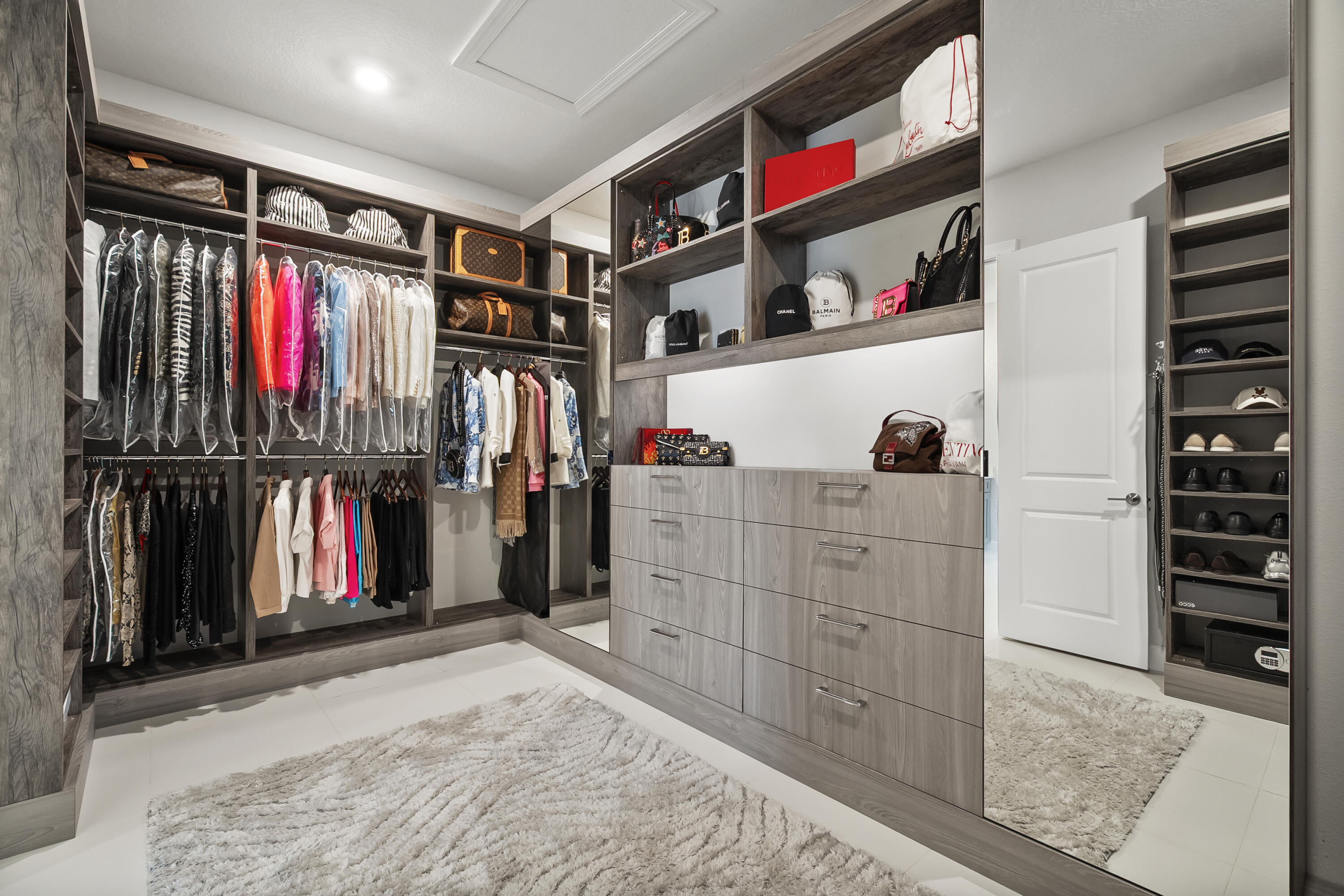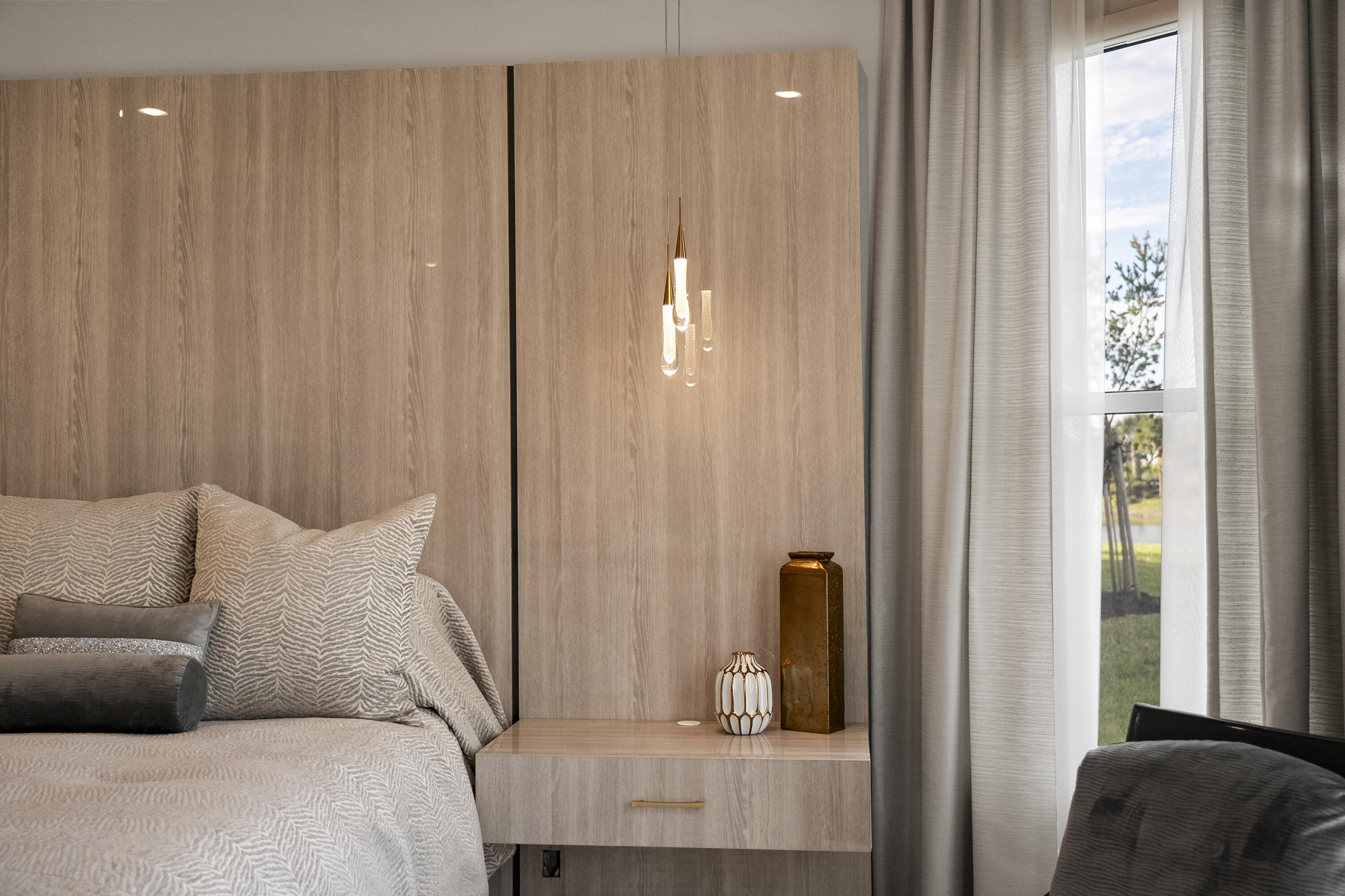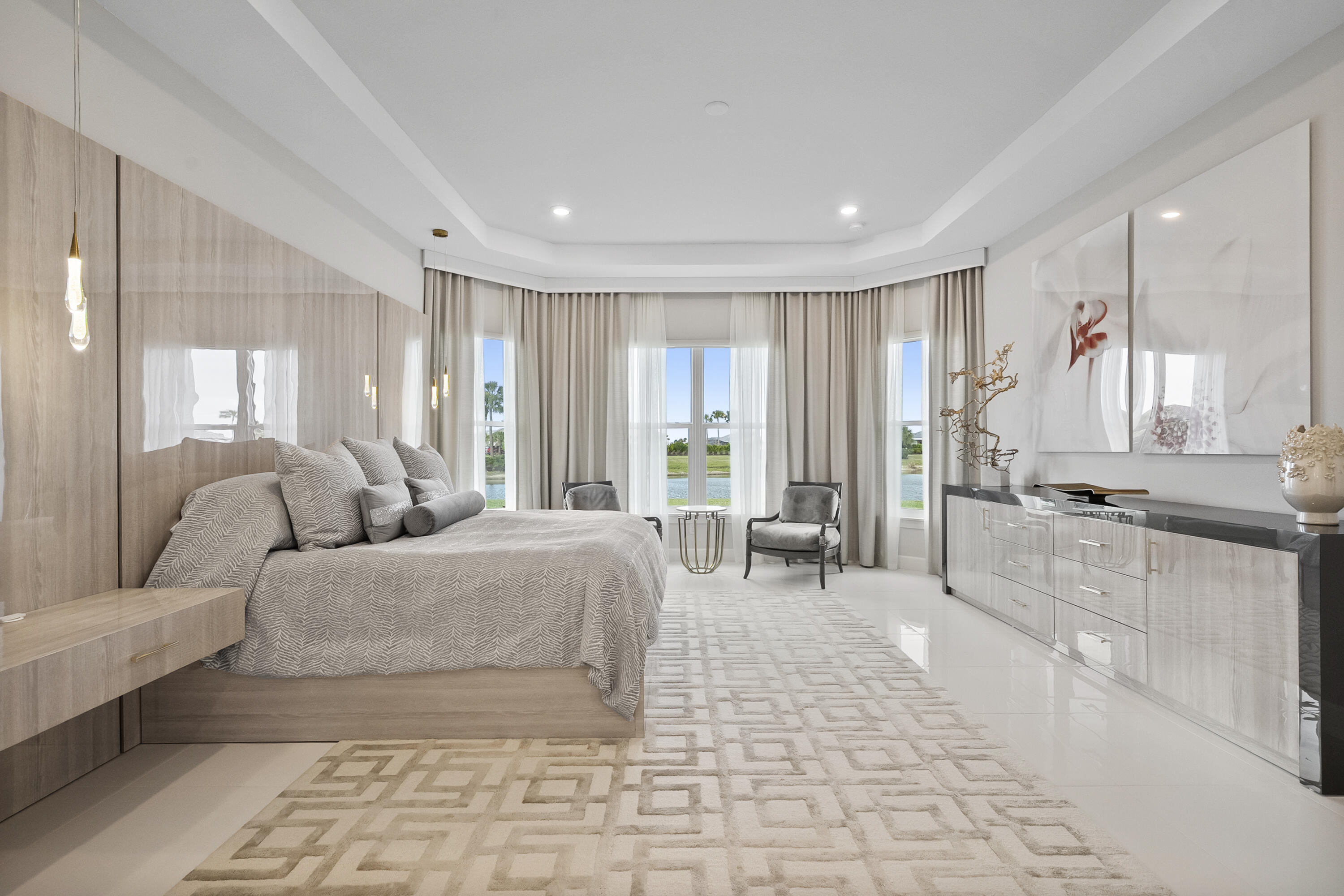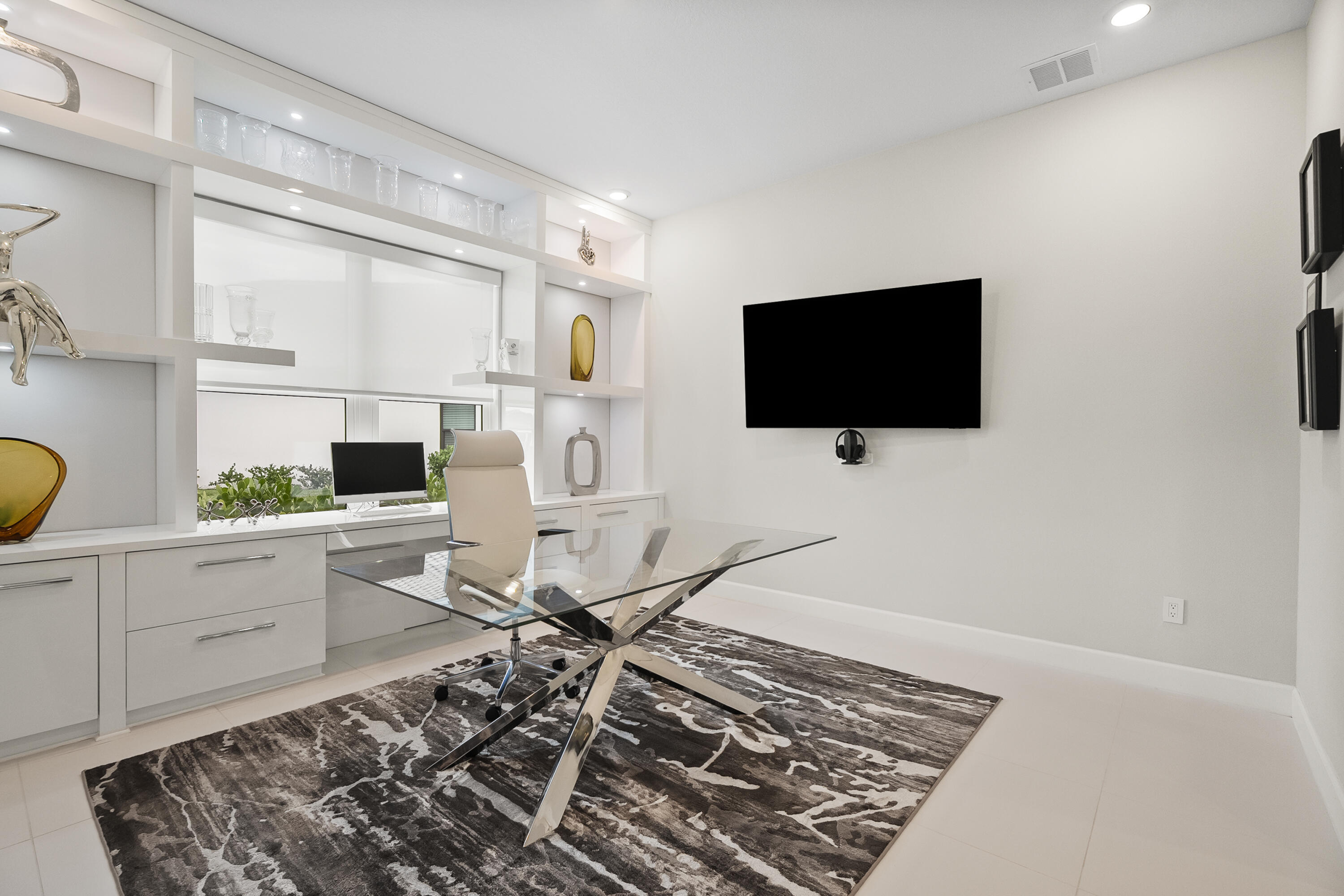 This Pallazio floor plan features extensive post-construction upgrades that go far beyond builder offerings. Offering 3 bedrooms, 3 bathrooms, plus a study/flex space, this exceptional home is situated on a quiet cul-de-sac on an oversized .36-acre pie-shaped lot that widens at the rear and overlooks a serene lake. Structural enhancements include an extended covered lanai, extended gourmet kitchen, outdoor kitchen gas and plumbing rough-ins, and extended bay windows in the primary suite. All impact windows and doors, paired with a brand-new barrel tile roof (2023), provide peace of mind and contribute to lower homeowners insurance rates. Inside, oversized porcelain tile flooring throughout (no carpet) creates a light, airy, and cohesive aesthetic. Professionally designed interiors take take this home to the next level with elevated finishes and thoughtful details throughout. The upgraded extended gourmet kitchen is an entertainer's dream, featuring all Thermador appliances, including a built-in refrigerator and wine fridge. A Thermador gas cooktop with griddle, paired with a custom range hood and built-in wall ovens, adds both function and style. The true showstopper is the 3-inch mitered porcelain countertops, a premium feature not offered by the builder, anchored by a striking waterfall island. The living room showcases a custom acrylic wood-finish built-in with integrated lighting. Pocket sliding glass doors seamlessly blend indoor and outdoor living, opening to lake views and an extended lanai equipped with motorized roll-down screens on all three openings, controlled at the touch of a button. The primary suite is nothing short of spectacular, enhanced by the bay window extension that floods the space with natural light and creates a private sitting area. The spa-like primary bath features dual shower heads, and the custom-designed walk-in closet is truly ready for your Chanel. This home offers a rare combination of design, upgrades, location, and lifestyle. A must-see for buyers seeking refined luxury and effortless indoor/outdoor living.