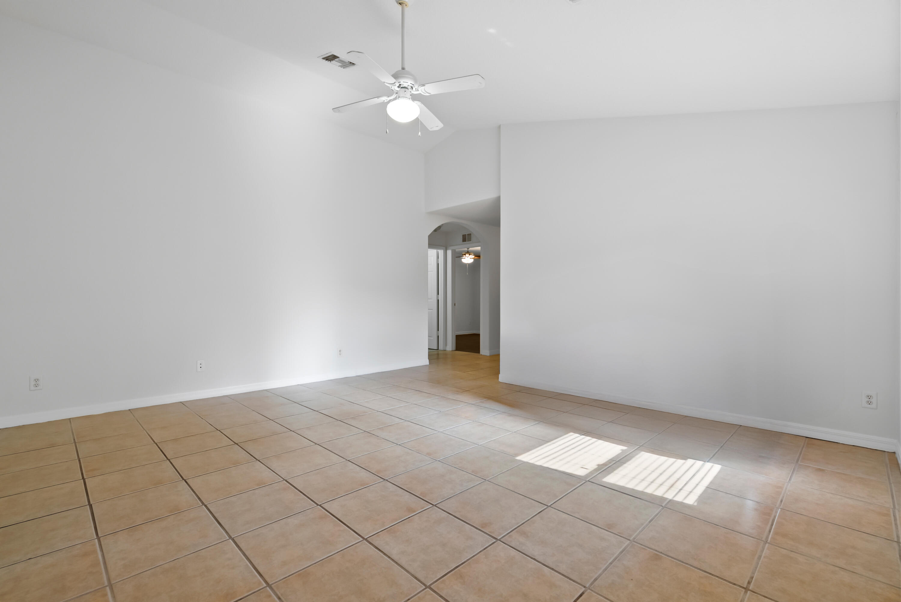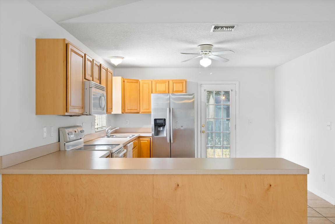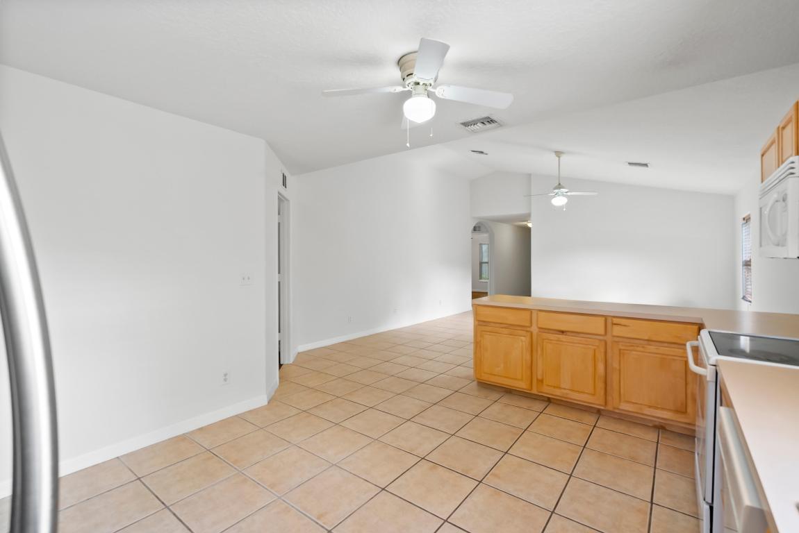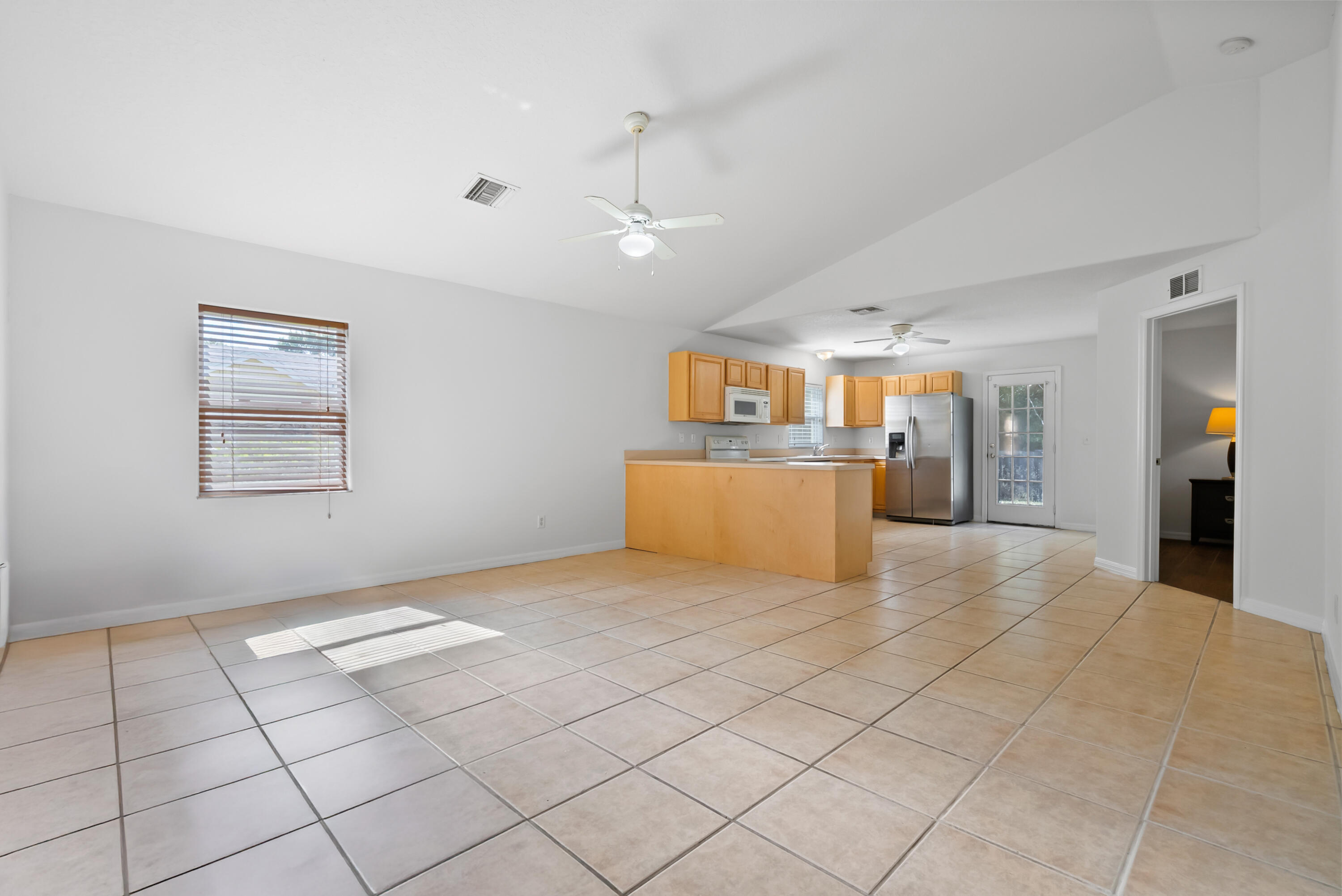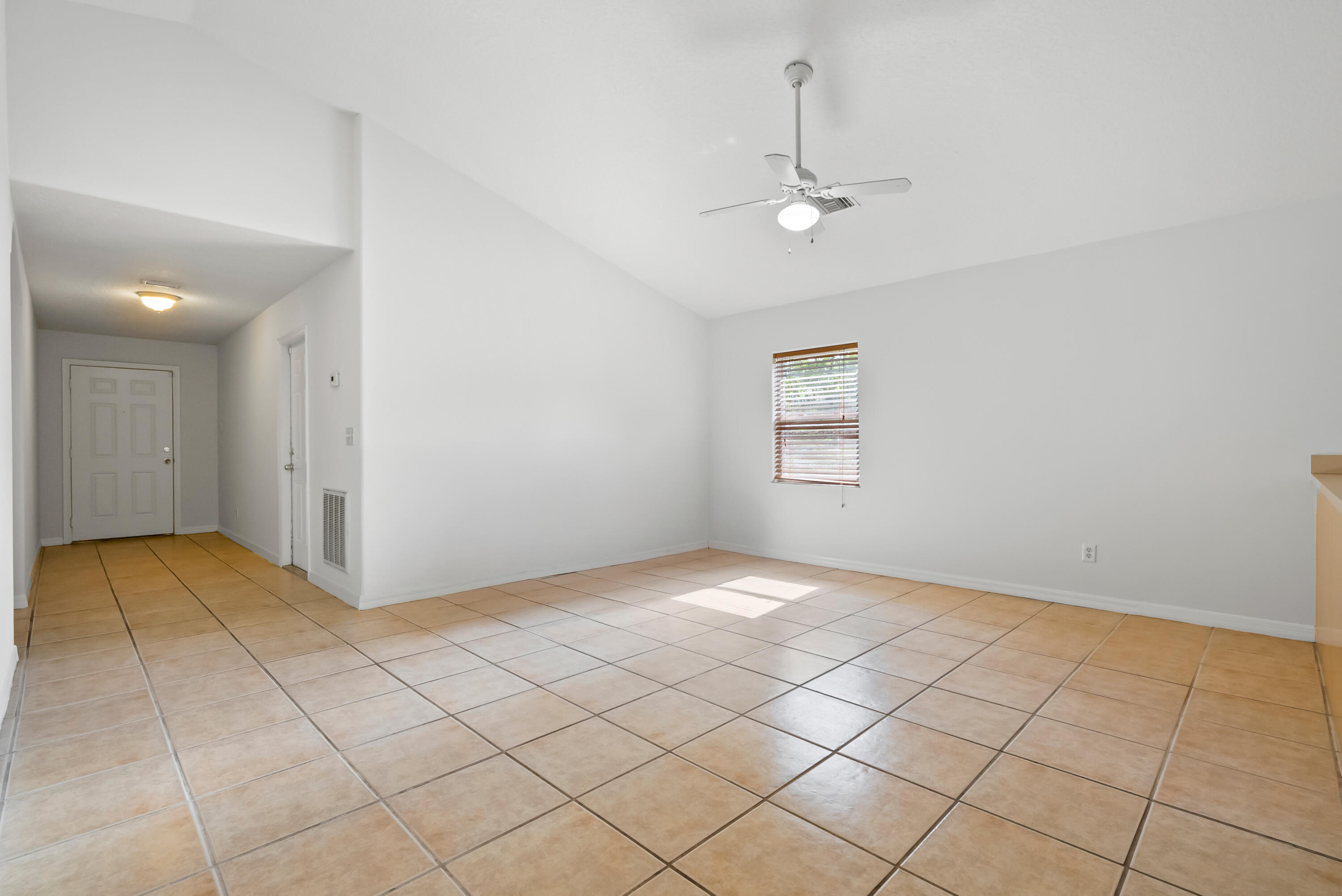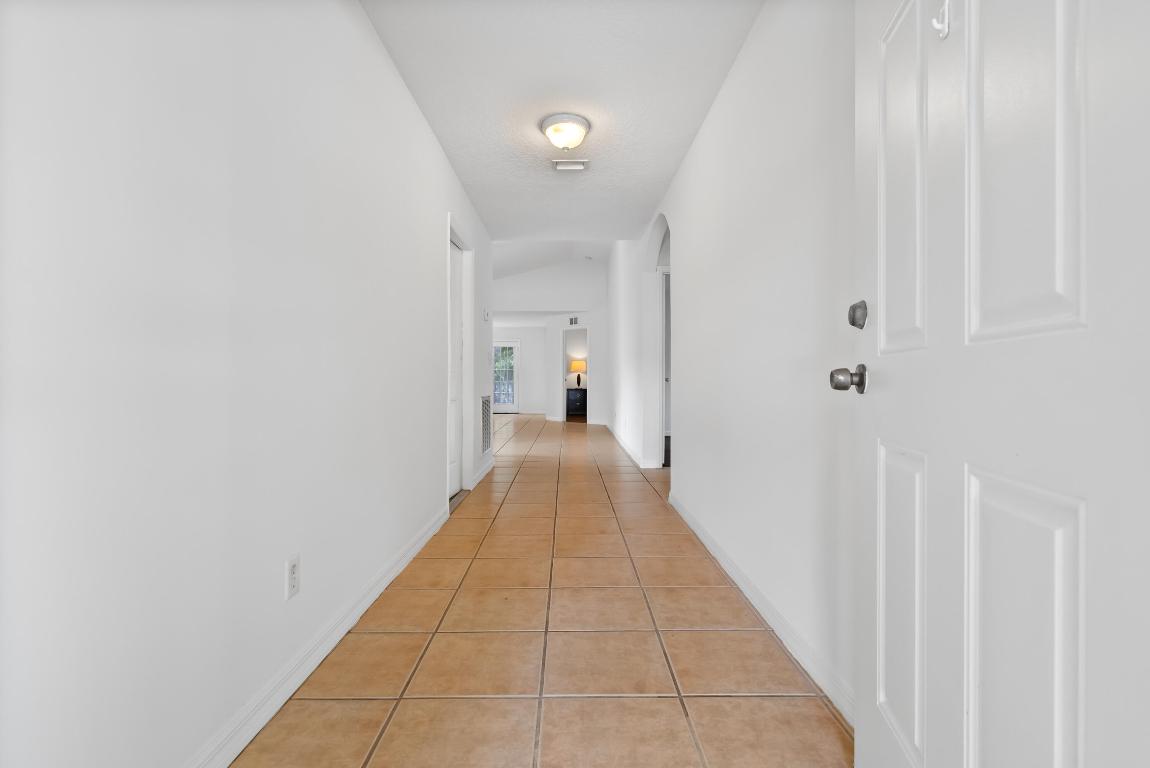 No carpet - tile throughout! This home features stylish wood-look tile flooring in the bedrooms for a clean, modern touch. Enjoy peace of mind with hurricane metal shutters for every opening, helping lower your homeowners insurance. Additional highlights include: Pull-down attic stairs for easy storage. AC only 3 years old. Water heater replaced 5 years ago. Freshly painted interior. Expansive vaulted ceilings enhance the open-concept living space. Covered front porch - perfect for morning coffee or relaxing evening. This home blends comfort, functionality, and style in one beautiful package. Don't miss out on this one!