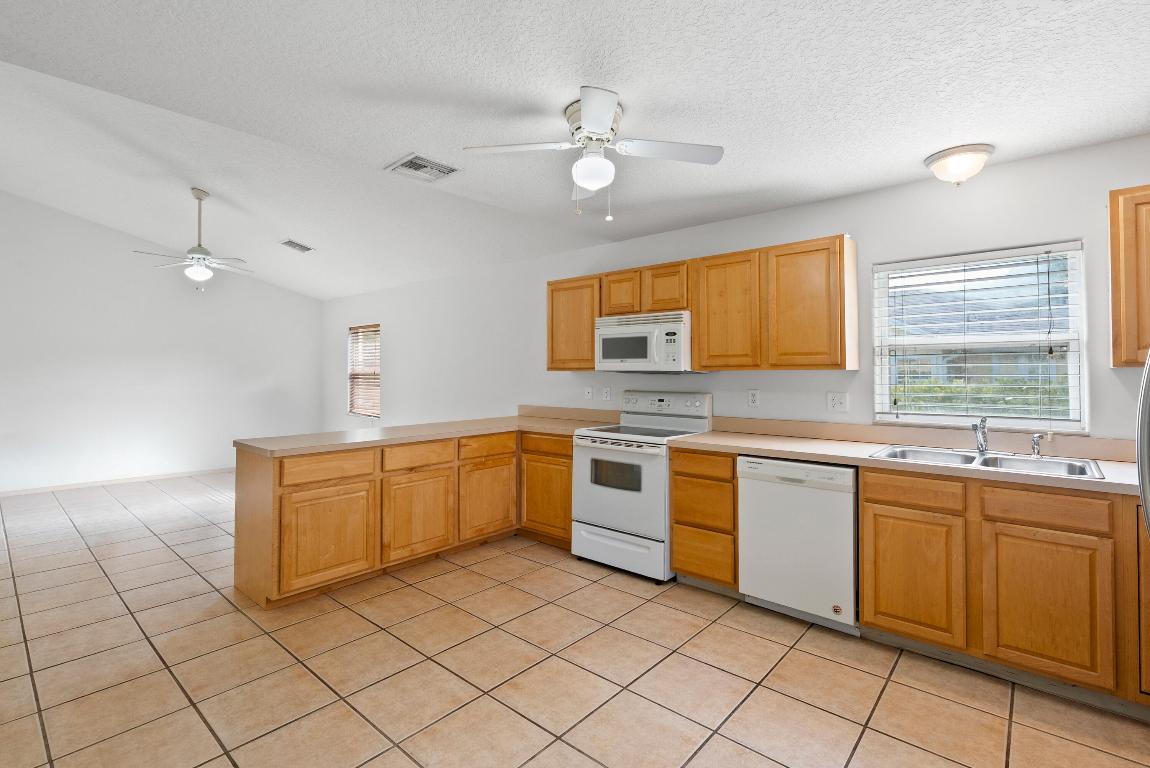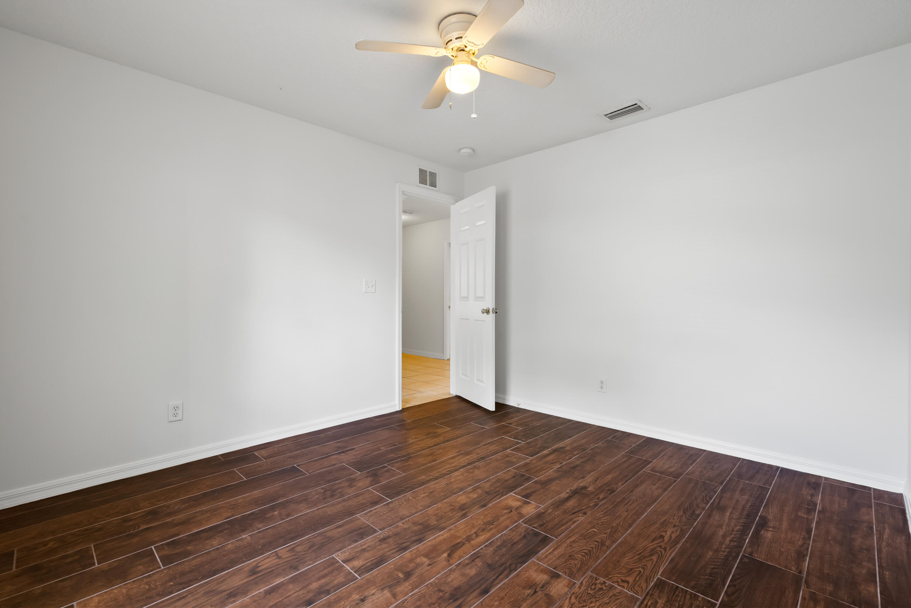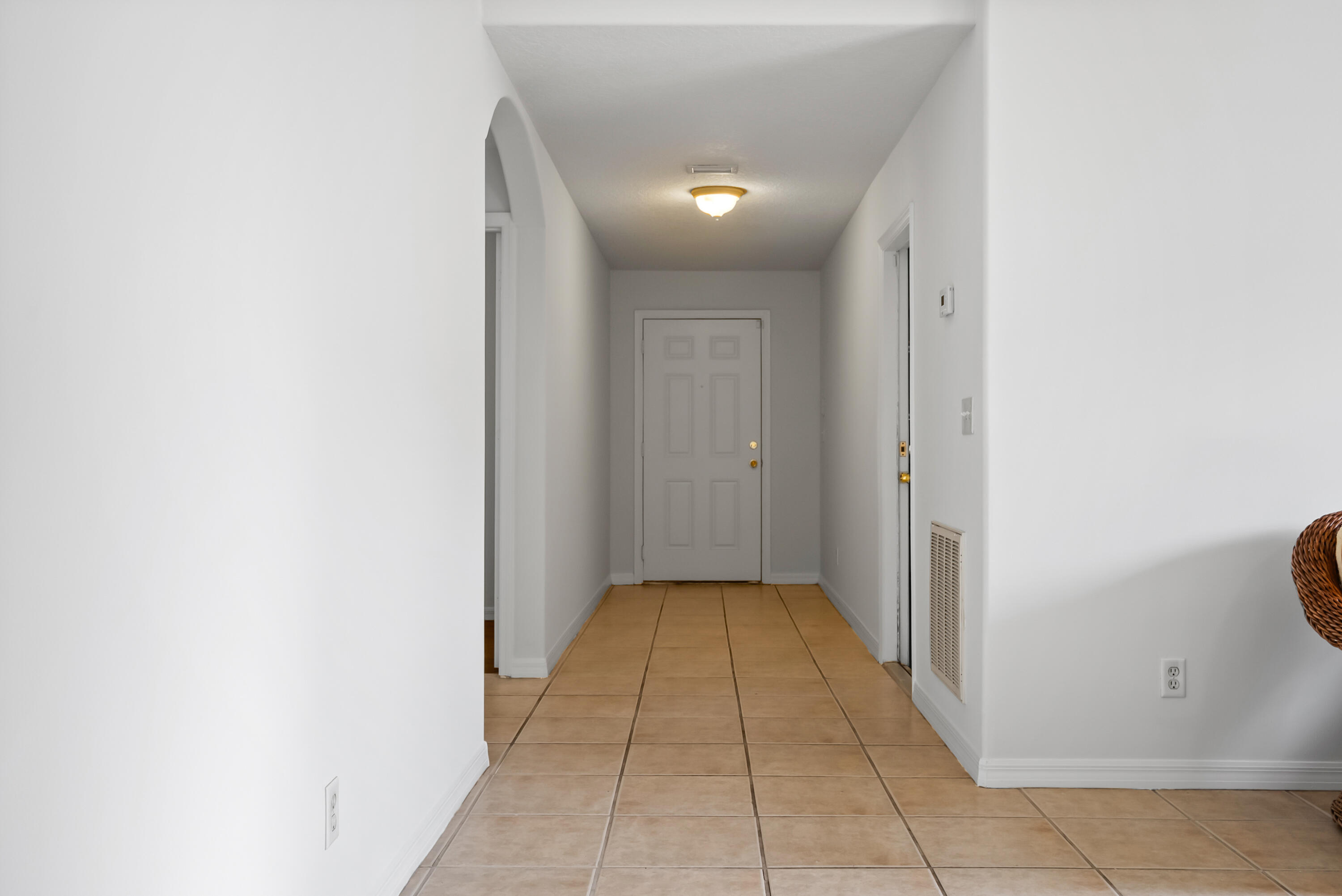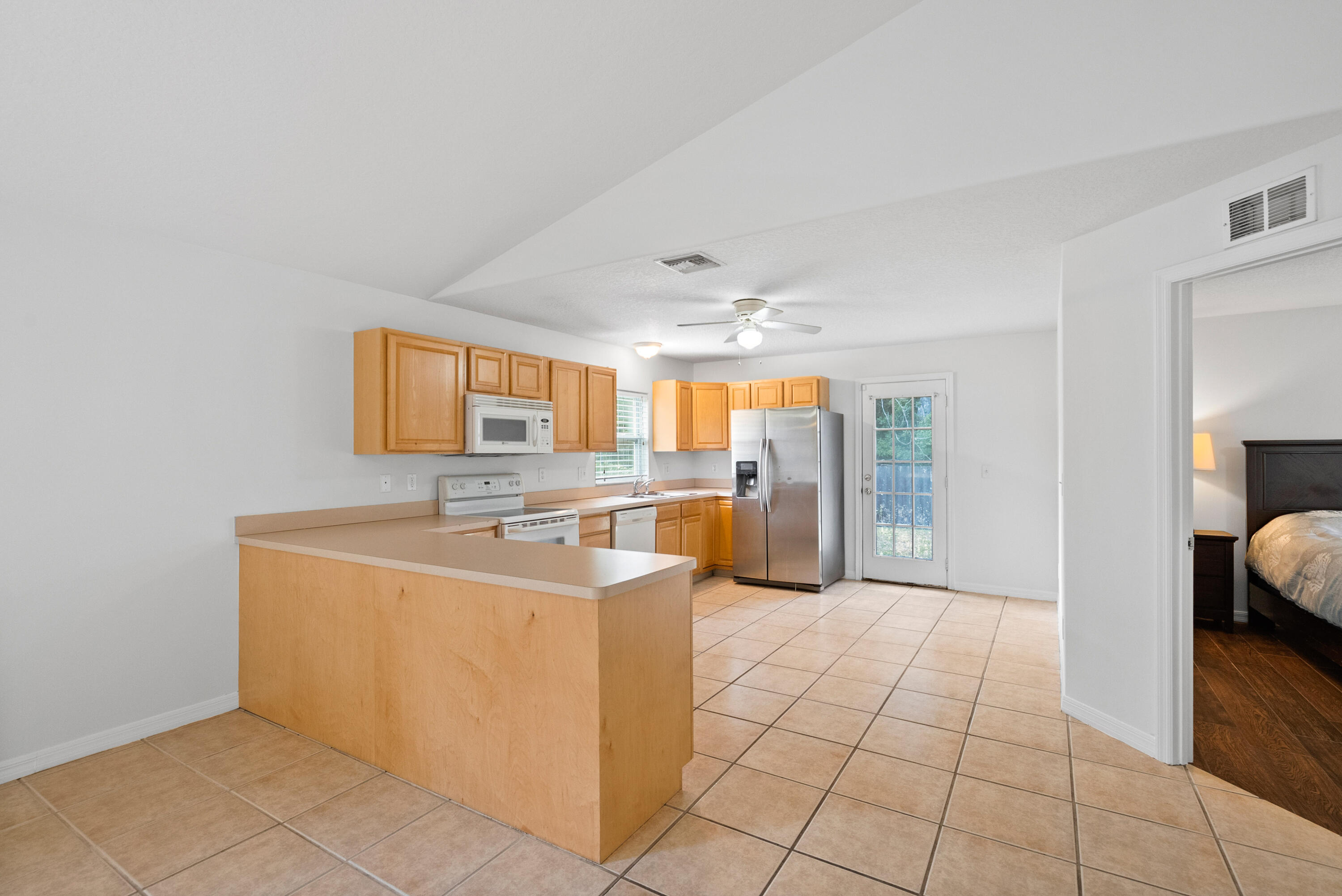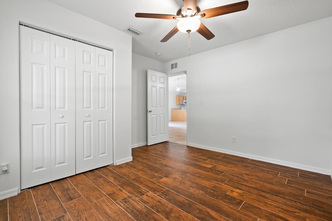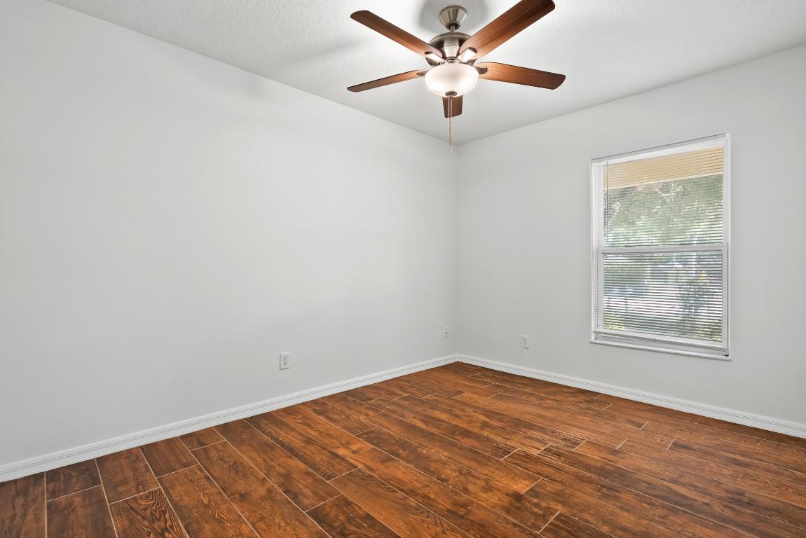 No carpet - tile throughout! This home features stylish wood-look tile flooring in the bedrooms for a clean, modern touch. Enjoy peace of mind with hurricane metal shutters for every opening, helping lower your homeowners insurance. Additional highlights include: Pull-down attic stairs for easy storage. AC only 3 years old. Water heater replaced 5 years ago. Freshly painted interior. Expansive vaulted ceilings enhance the open-concept living space. Covered front porch - perfect for morning coffee or relaxing evening. This home blends comfort, functionality, and style in one beautiful package. Don't miss out on this one!