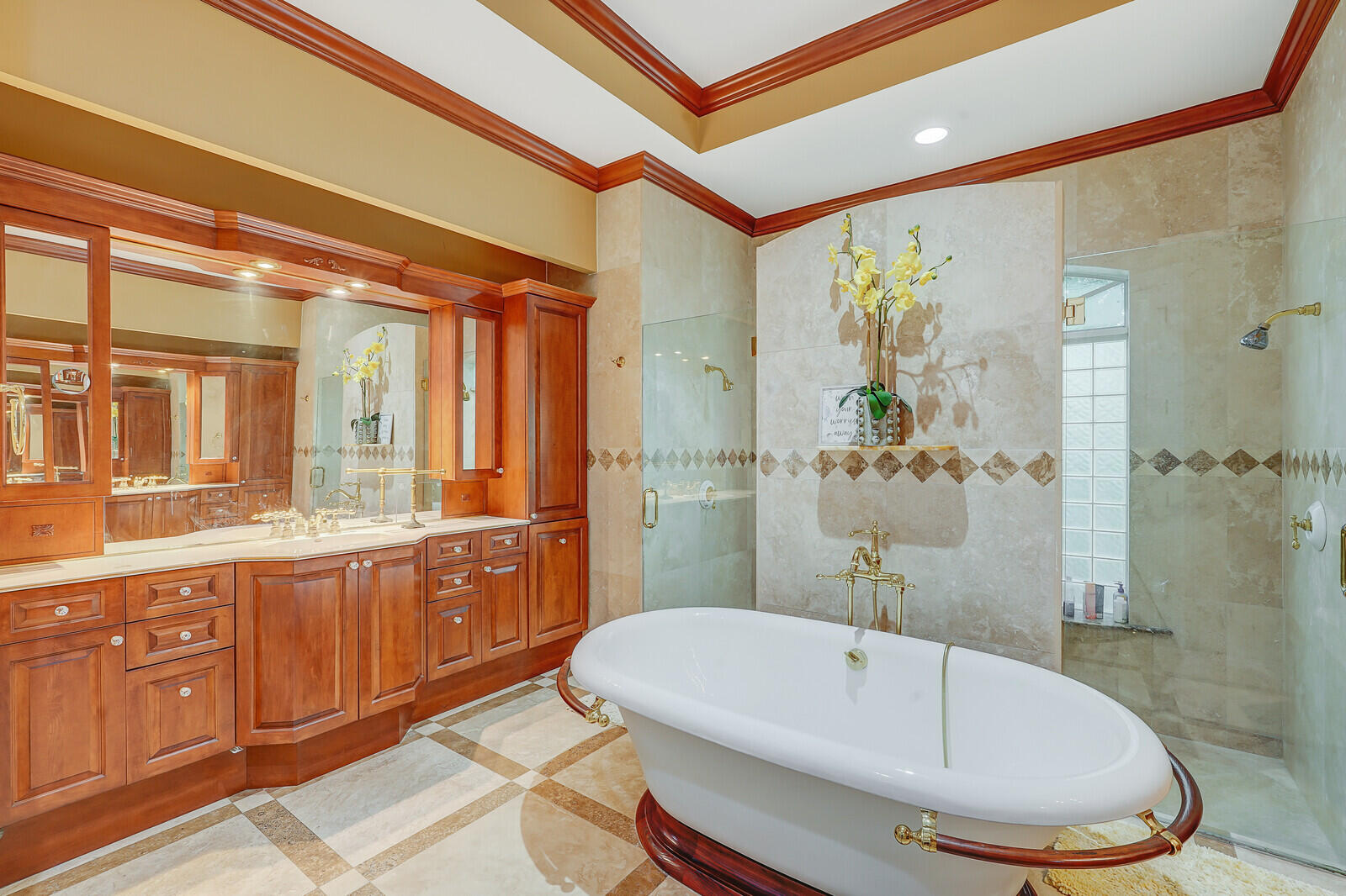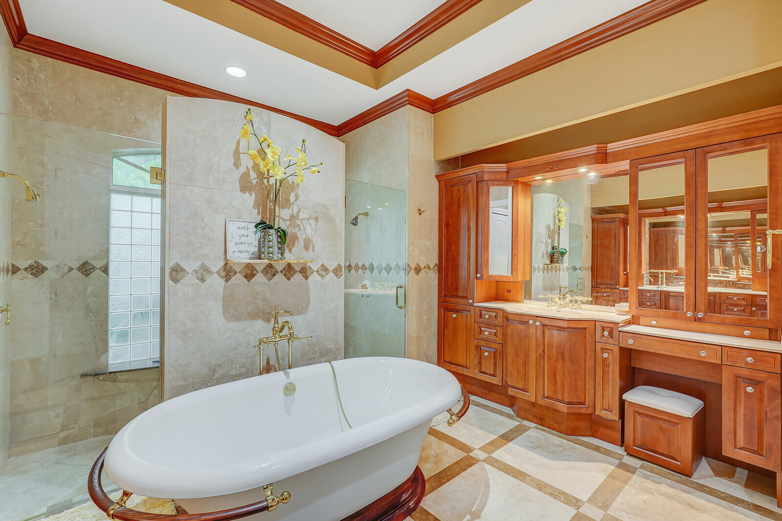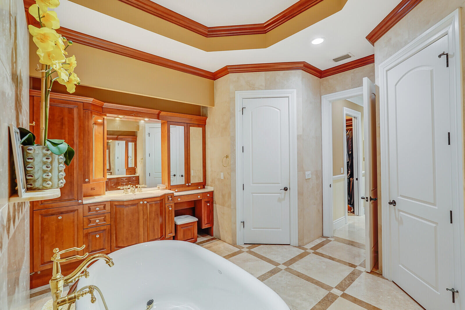 Large sized Primary Bedroom includes His and Her Walk-In Closets, with 3 additional Storage Closets. Luxurious en-suite features: Gold Trim Hardware, gorgeous stand alone Soaking Tub, 2 separate entry shower doors that leads to an adjoining Walk-In Shower. Multiple storage by means of bathroom Drawers and Cabinets. His and Her Commode, and a Bidet.