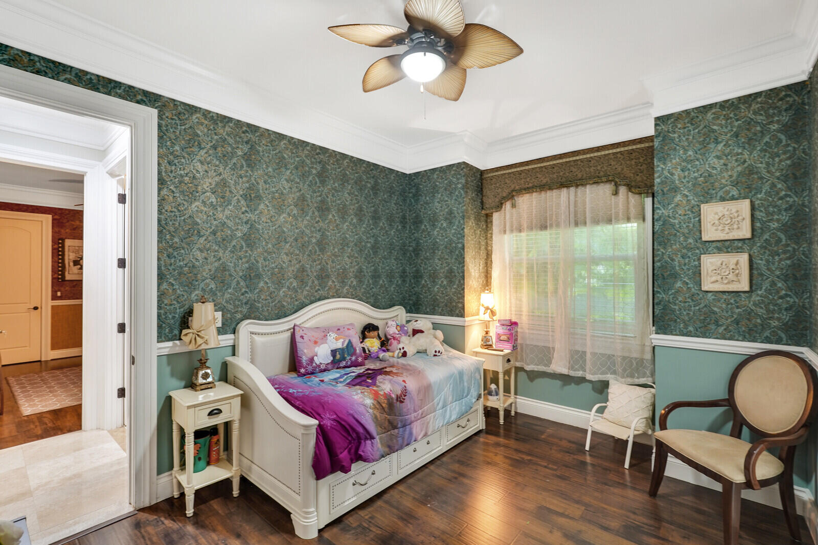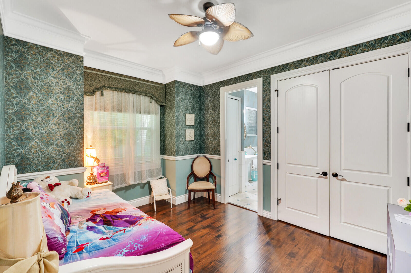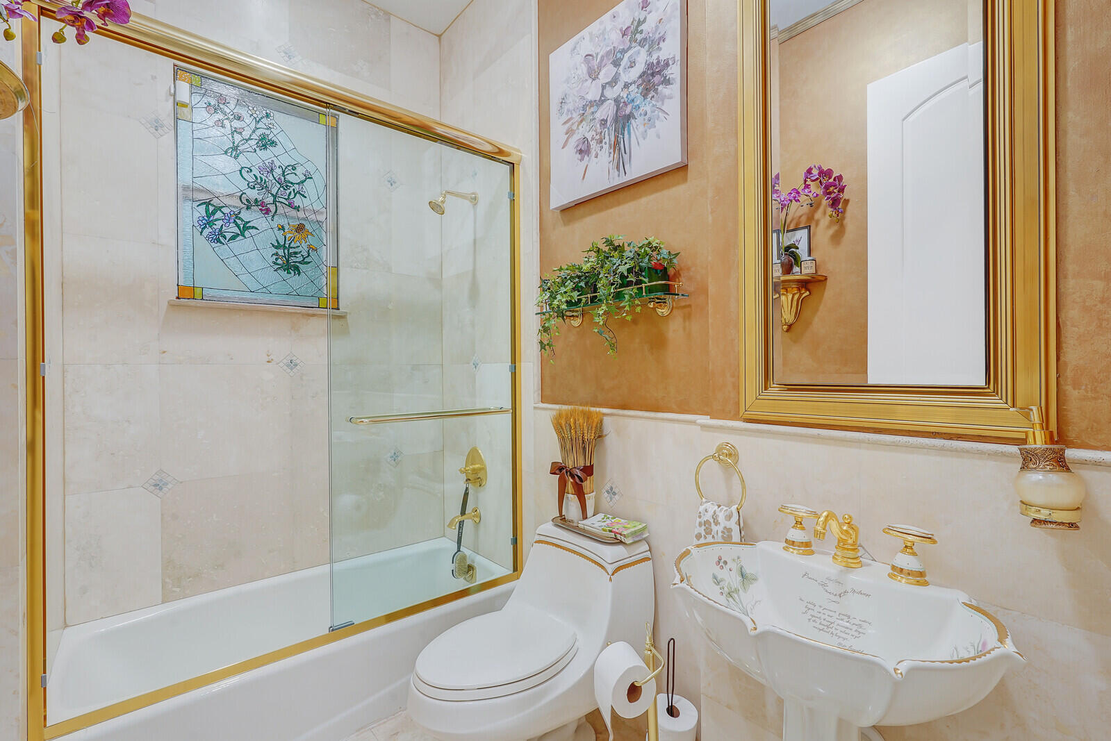 Large sized Primary Bedroom includes His and Her Walk-In Closets, with 3 additional Storage Closets. Luxurious en-suite features: Gold Trim Hardware, gorgeous stand alone Soaking Tub, 2 separate entry shower doors that leads to an adjoining Walk-In Shower. Multiple storage by means of bathroom Drawers and Cabinets. His and Her Commode, and a Bidet.