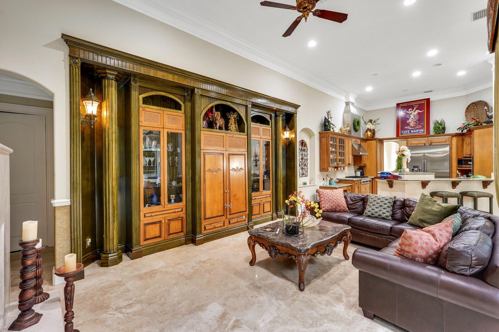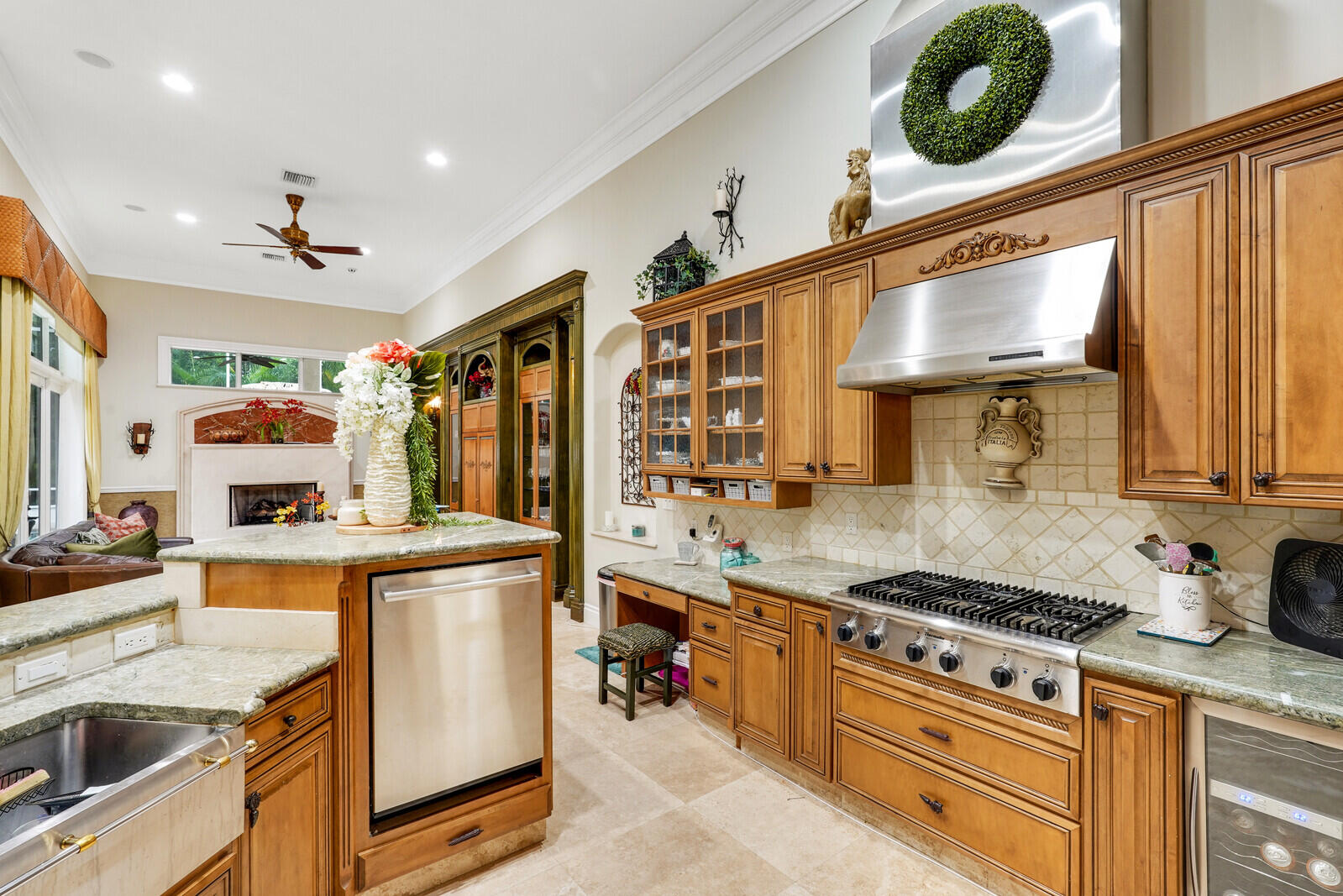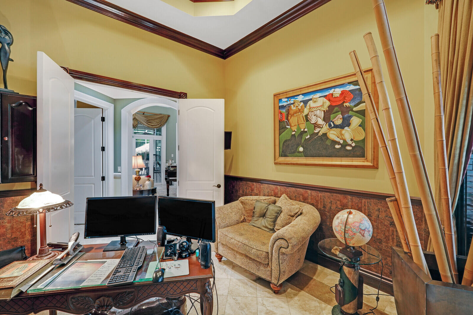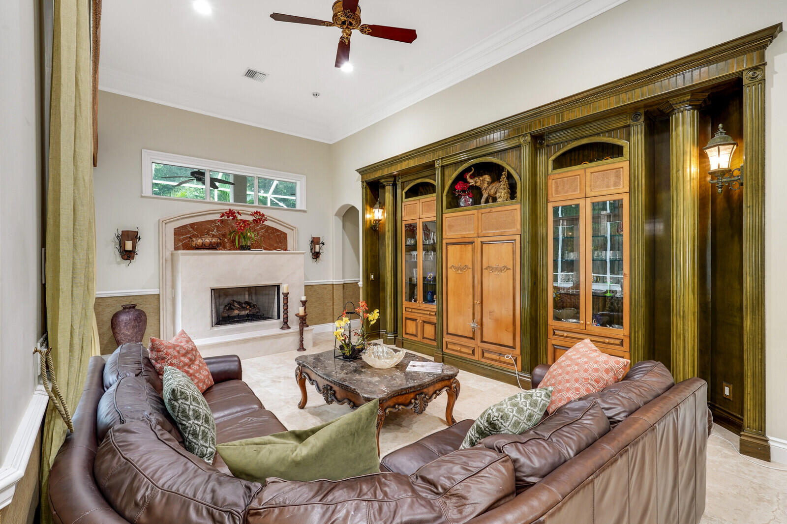 Grand marbled entry, home boasts tray & coffered ceilings, vaulted/cathedral ceilings, Crown molding, formal dining and living room, built in fire place, custom library/office, a Chef's dream kitchen, with elevated dishwasher, double oven, Thermador 6 burner Gas range, granite countertops Tiled Backsplash, custom Stainless Steel Appliances, beautiful custom Cabinets with Molding, Home Theatre room, Split floor plan, Italian Marble floors throughout. Convenience of Impact Windows and Doors, a $100K value in Drapes/custom Window Treatments-that will convey, Whole House Generator, Security Cameras, Sound System. Front load Washer and Dryer, build in Laundry Tub and Laundry Rack, lots of space for storage.
