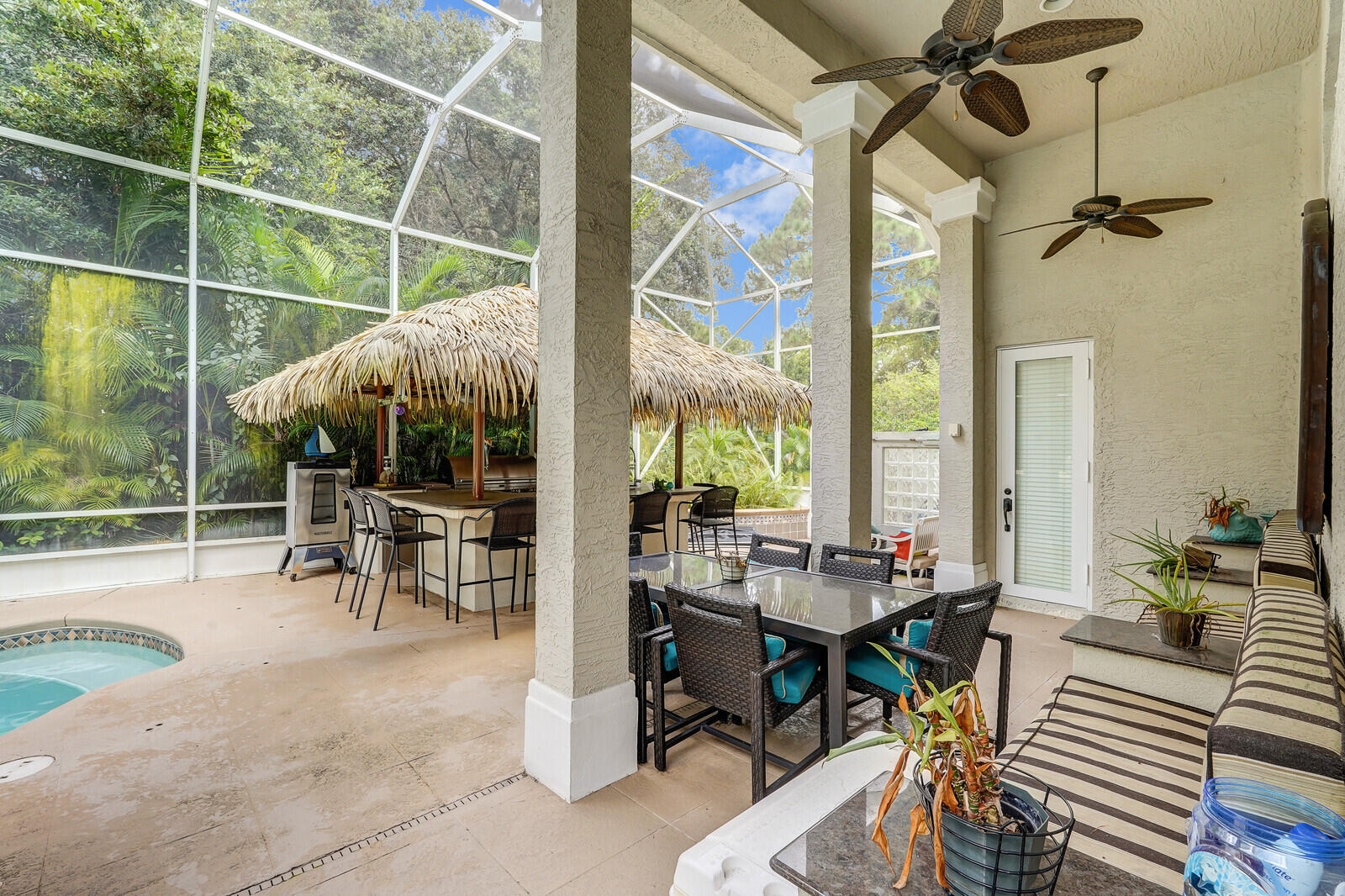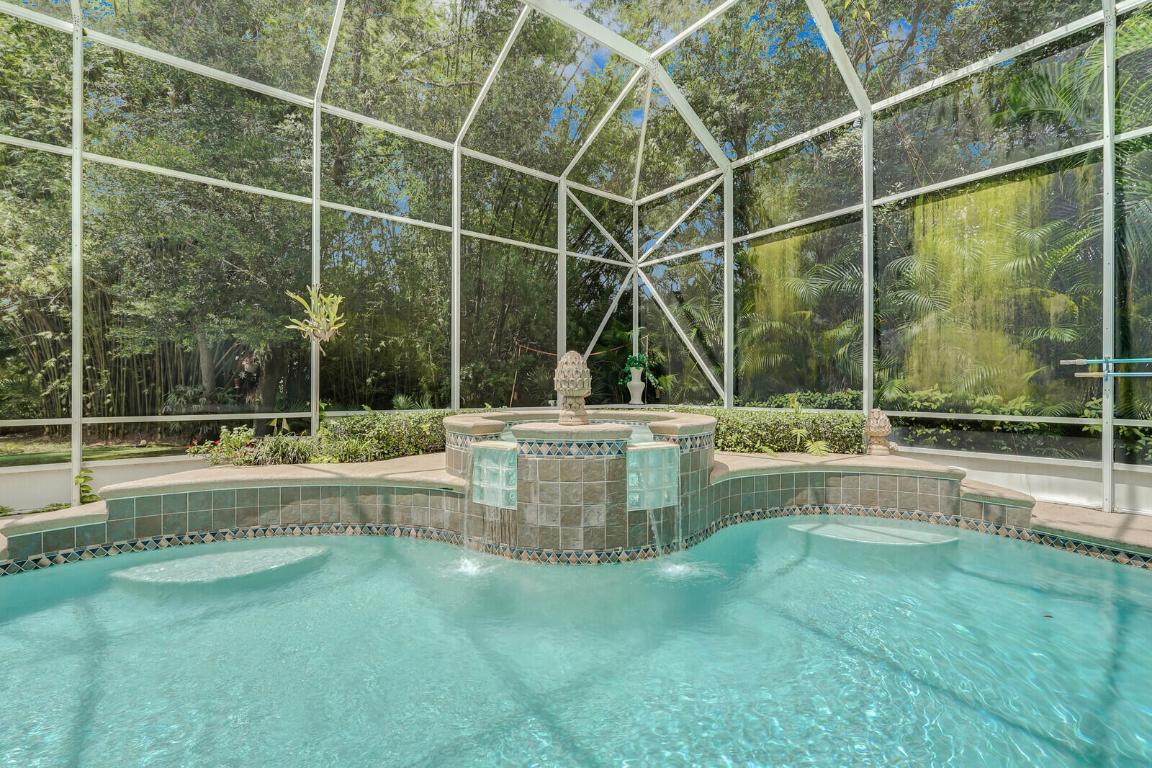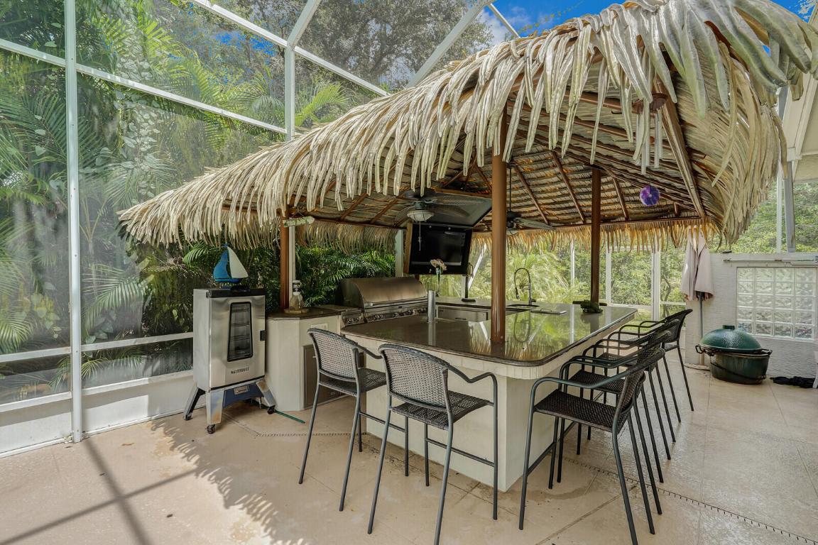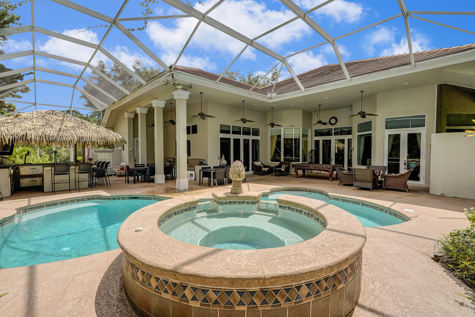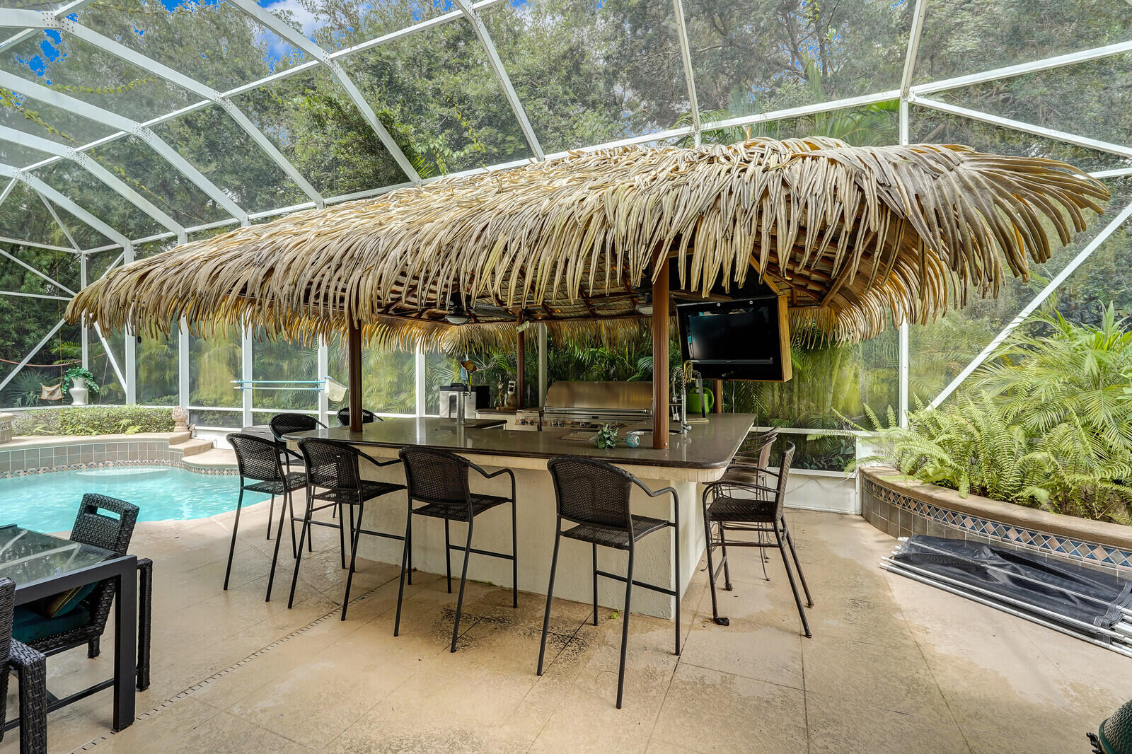 On the Exterior, Vast Screened in Pool and lanai. Tiki bar and complete outdoor kitchen. Great for entertaining. Spa hot tub, Small Putting Greens for at home relaxation. Lots of trees for added privacy.