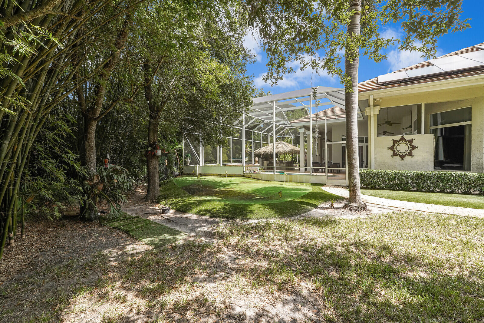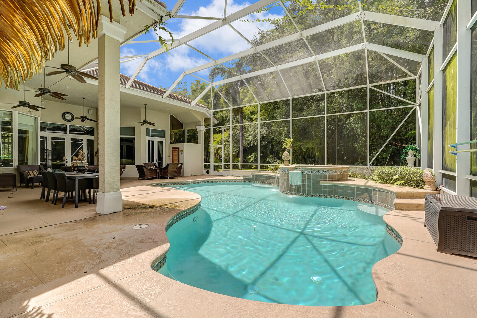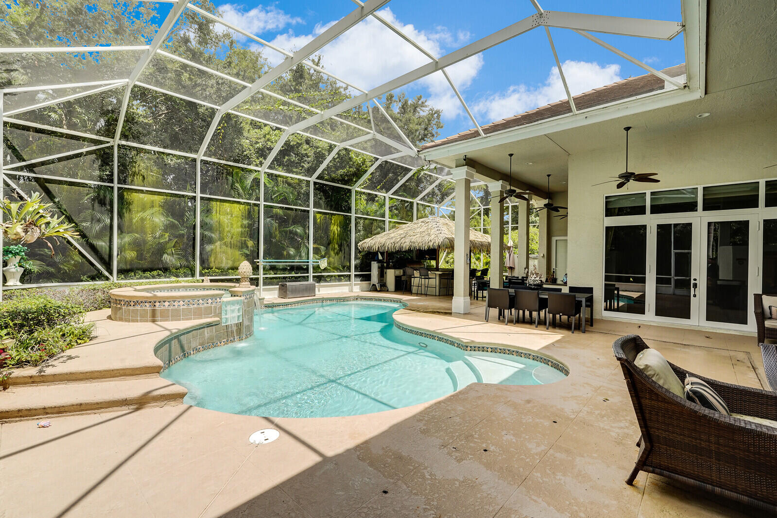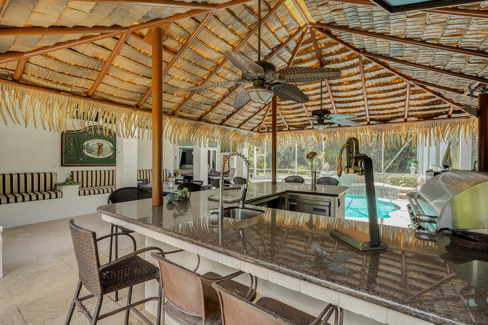 On the Exterior, Vast Screened in Pool and lanai. Tiki bar and complete outdoor kitchen. Great for entertaining. Spa hot tub, Small Putting Greens for at home relaxation. Lots of trees for added privacy.
