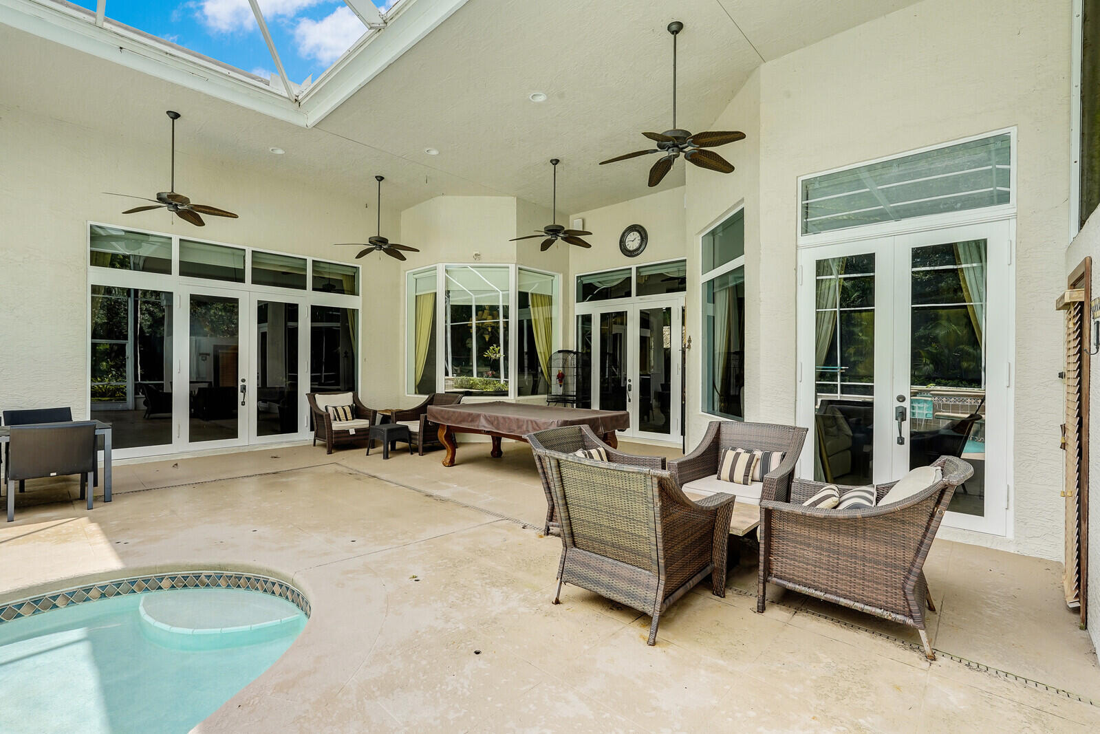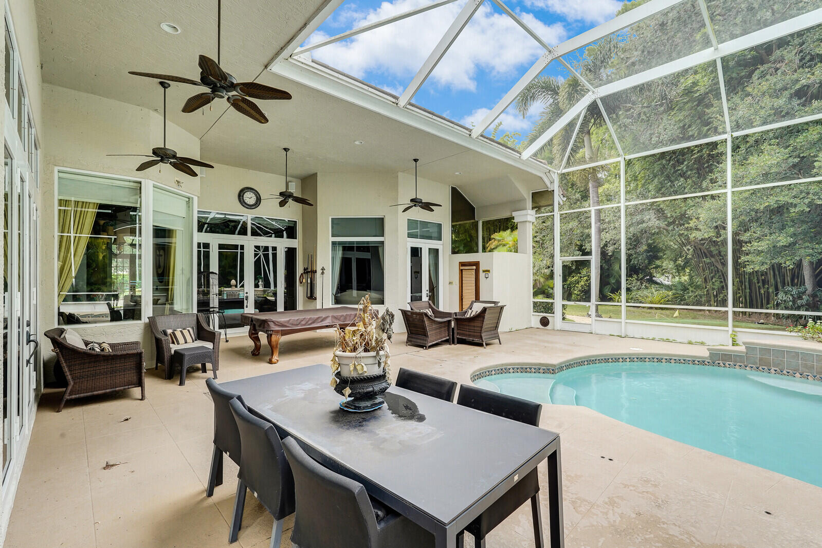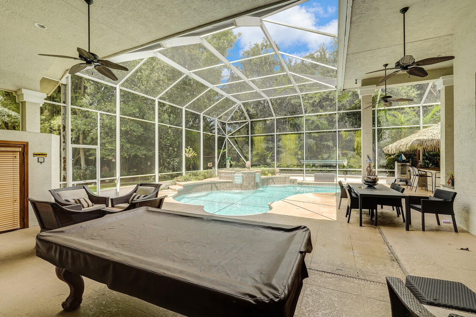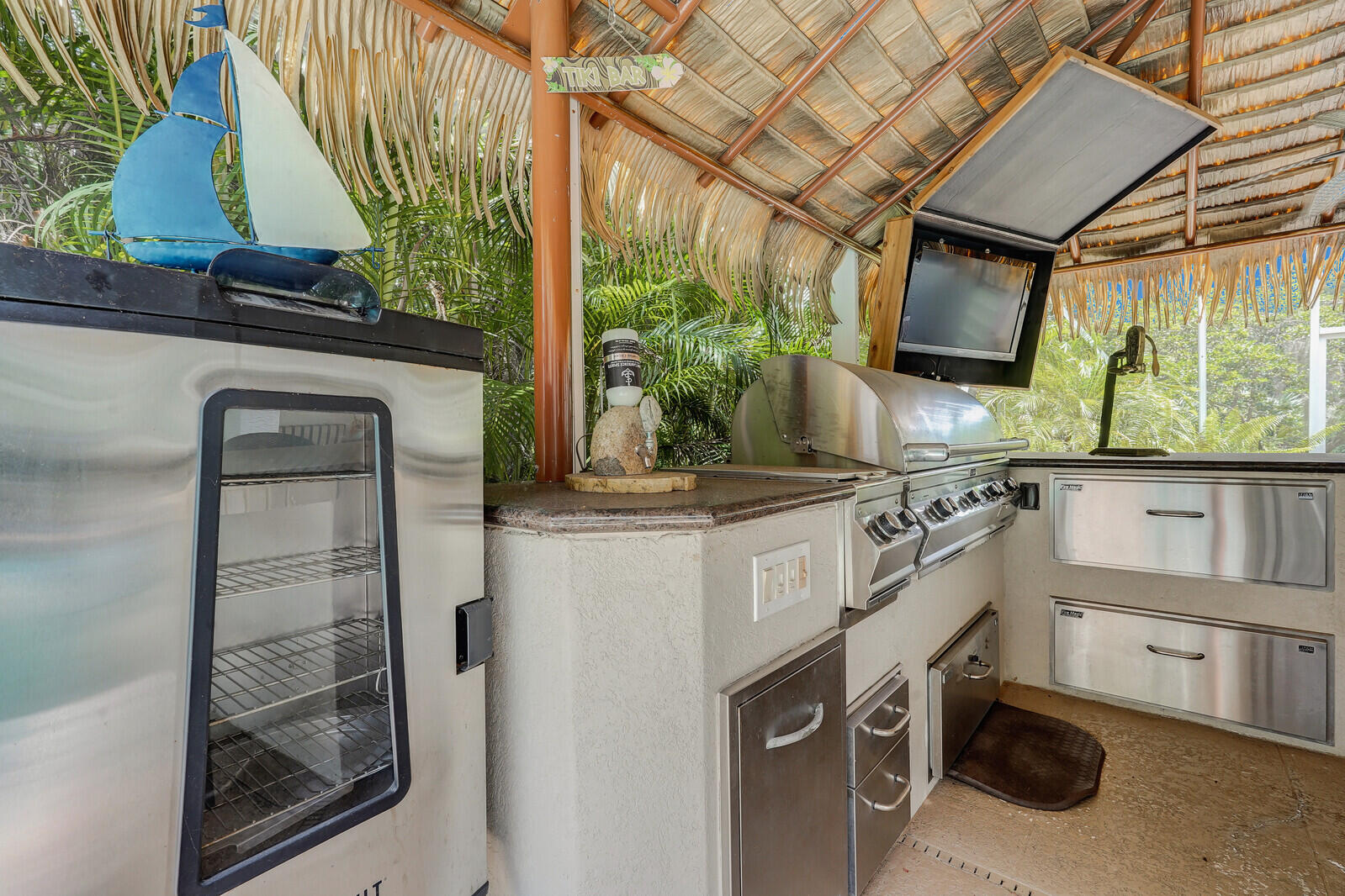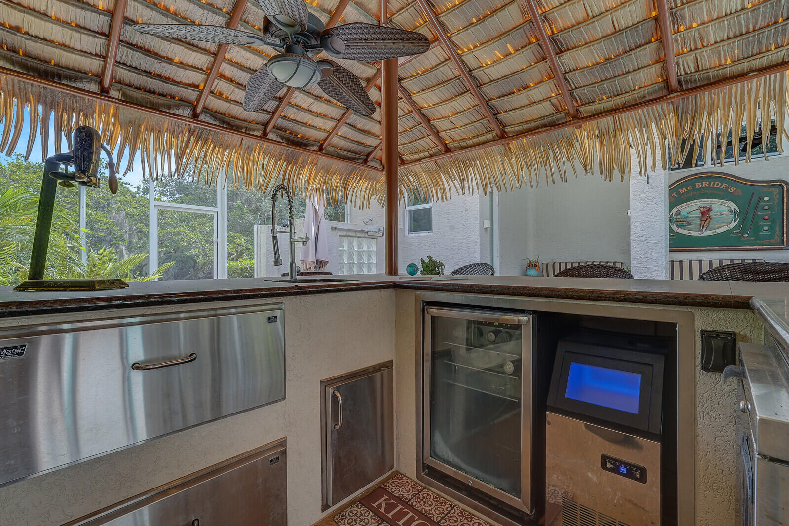 On the Exterior, Vast Screened in Pool and lanai. Tiki bar and complete outdoor kitchen. Great for entertaining. Spa hot tub, Small Putting Greens for at home relaxation. Lots of trees for added privacy.